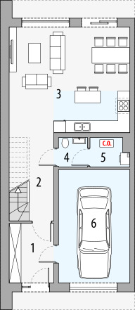 Na parterze znajduje się przestrzenny jednostanowiskowy garaż, który zapewnia miejsce na bezpieczne przechowywanie samochodu. Tuż obok garażu znajduje się toaleta z ukrytą za drzwiami kotłownią wraz z pralnią, co zapewnia wygodę użytkowania oraz optymalizację przestrzeni. W tylnej części parteru rozmieszczona jest duża, otwarta kuchnia z wyspą, która staje się sercem domu, idealnym miejscem do spotkań i wspólnego gotowania. Bezpośrednio sąsiaduje z nią jasny i przestronny salon, z którego można wyjść na taras ogrodowy, tworząc płynne połączenie między wnętrzem a otoczeniem.