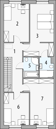 Piętro domu Zenit to przestrzeń dedykowana prywatności i relaksowi. Znajdują się na nim aż cztery pokoje i dwie łazienki, co pozwala na elastyczne zagospodarowanie przestrzeni według potrzeb mieszkańców. Jedna z wymienionych stref została przeznaczona na sypialnię z prywatną, dużą garderobą oraz przestronną łazienką, tworząc strefę relaksu i komfortu dla właścicieli domu.