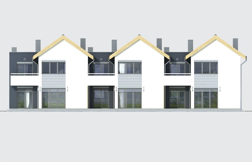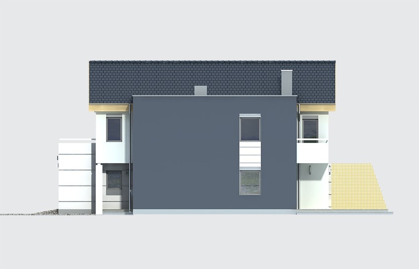 Dom zapewnia również komfort w pięknie skomponowanym wnętrzu. Wygodnie ustawny salon z jadalnią i kuchnią znajdują się na parterze, a na piętrze trzy dodatkowe sypialnie, garderoba i łazienka. Projekt przewiduje garaż w bryle budynku. Dom można wybudować na dosyć wąskiej działce.