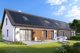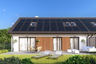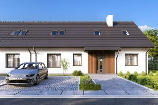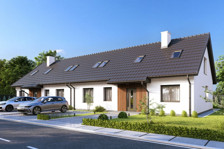 Ten projekt to połączenie nowoczesnej estetyki i maksymalnej praktyczności, dostosowane do potrzeb dwóch rodzin lub właścicieli poszukujących domu z niezależnymi lokalami. Styl nowoczesnej stodoły, który wyróżnia prostą, lecz wyrazistą bryłę, został tutaj perfekcyjnie zaadaptowany dla bliźniaczego układu. Elewacja łączy biel z drewnianymi akcentami, a harmonijne przeszklenia wypełniają wnętrza obu lokali naturalnym światłem. Dodatkowe atuty, takie jak panele fotowoltaiczne, podkreślają ekologiczny charakter projektu, idealny dla osób dbających o środowisko i niższe koszty utrzymania.