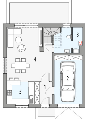 Na parterze domu znajduje się przestronna kuchnia, która płynnie łączy się z dużym, dobrze doświetlonym salonem. Dzięki dużym oknom, salon wypełniony jest naturalnym światłem i zapewnia bezpośredni dostęp do ogrodu, gdzie można spędzać czas na świeżym powietrzu i cieszyć się przyrodą. Przy schodach prowadzących na poddasze znajduje się dyskretnie schowana toaleta, a w głąb domu wydzielona została strefa gospodarcza z pralnią i piecem gazowym. Dodatkową wygodę zapewnia jednostanowiskowy garaż.
