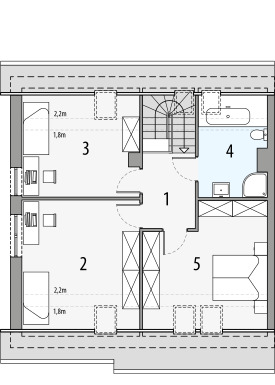 Poddasze domu Sara 2 mieści piękną, dużą łazienkę oraz trzy przytulne pokoje. Okna połaciowe na dachu zapewniają doskonałe doświetlenie naturalnym światłem, tworząc jasną i komfortową atmosferę.