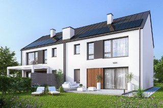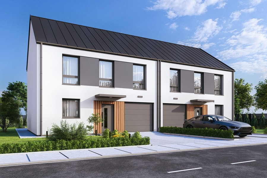 Projekt domu Sara 3 to idealny projekt dla osób szukających funkcjonalnego i przestronnego domu w zabudowie szeregowej, bliźniaczej lub jako dom dwulokalowy. Prosta, kwadratowa bryła budynku sprawia, że jest on łatwy w budowie i aranżacji, a dwuspadowy dach o kącie nachylenia 35 stopni i kalenicy równoległej do frontu nadaje mu klasyczny i elegancki wygląd.