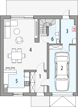 Parter domu składa się z: Garażu jednostanowiskowego, z którego można wyjść na drugą stronę budynku prosto przez kotłownię. Dużej otwartej kuchni, która płynnie łączy się z dobrze doświetlonym salonem. Taka otwarta przestrzeń sprzyja integracji rodziny i wspólnemu spędzaniu czasu. Tarasu ogrodowego, który jest idealnym miejscem na relaks i odpoczynek na świeżym powietrzu.