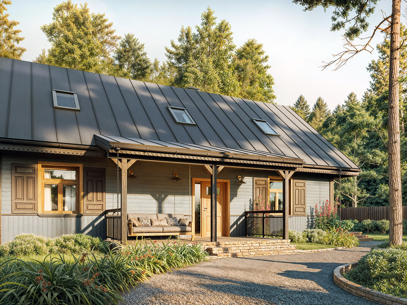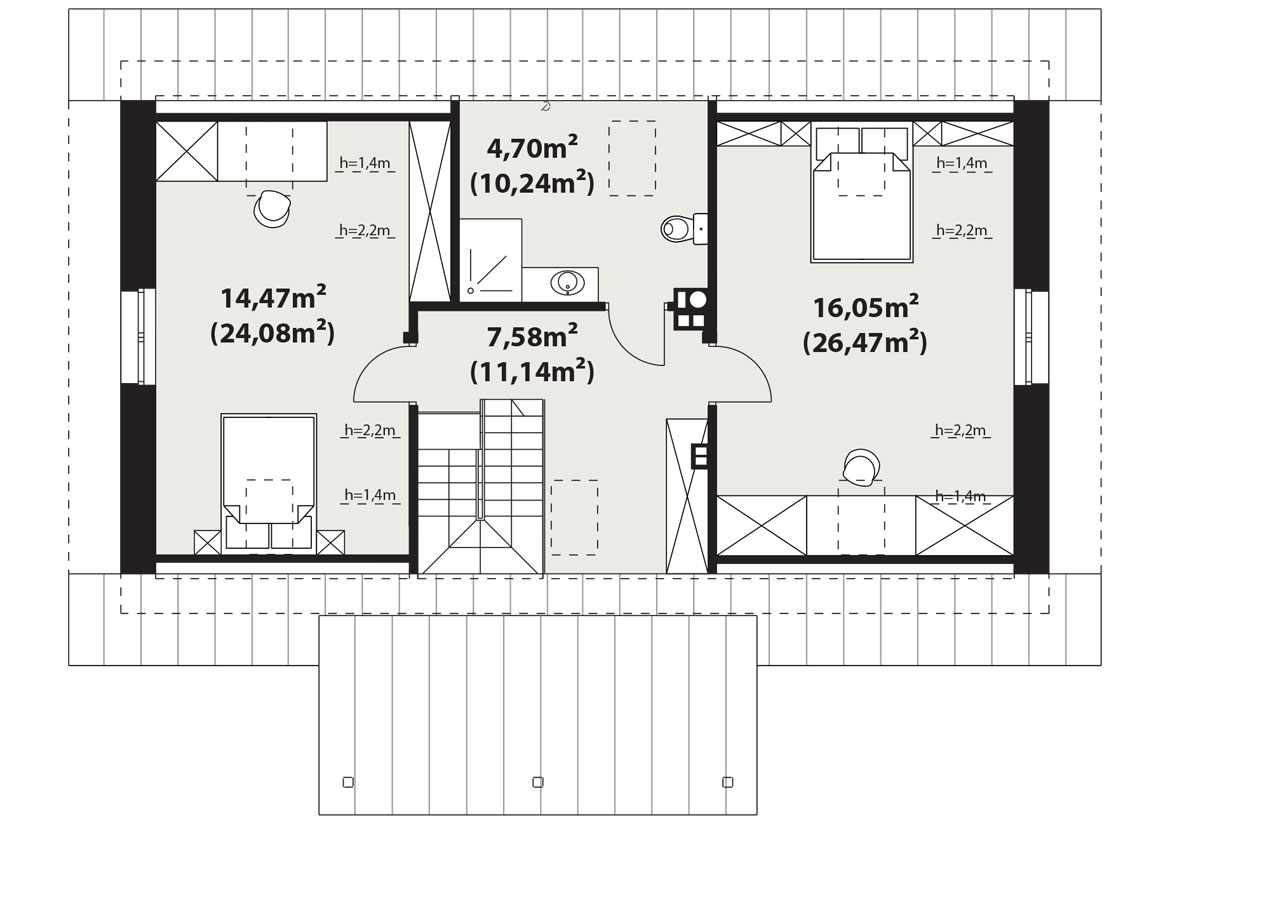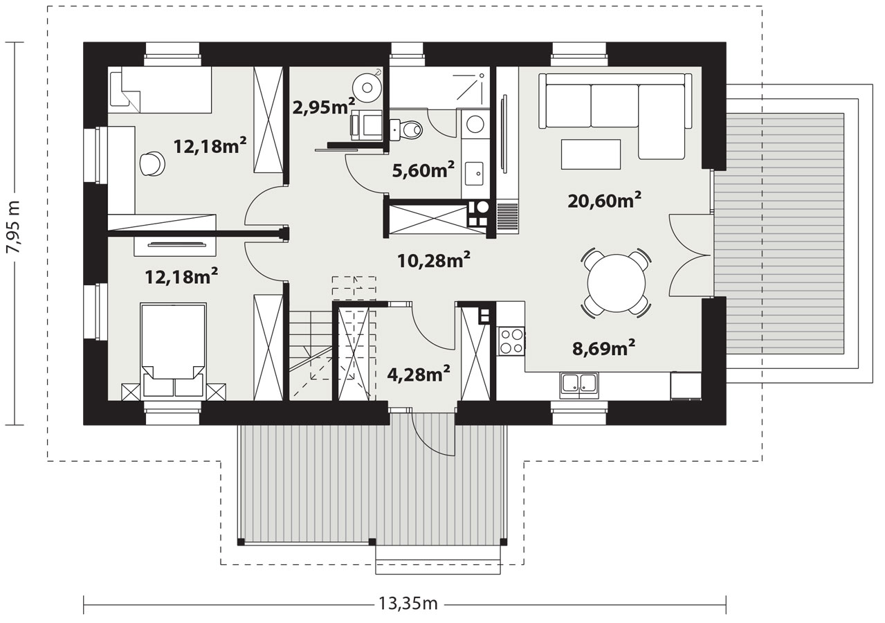 Surażkowo 2 to projekt niedużego domu z użytkowym poddaszem nawiązującego stylem do tradycyjnych podlaskich domów. Posiada na parterze dwie sypialnie, otwartą część dzienną, łazienkę oraz pomieszczenie techniczne. Na poddaszu zlokalizowano dodatkowe dwie sypialnie i łazienkę. Wszystkie wewnętrzne ściany parteru i poddasza są działowe co pozwala na wiele sposobów ich aranżowania. Wejście do domu jest przez duży, zadaszony taras-werandę. Dom standardowo wyposażony jest w pompę ciepła oraz kominek.