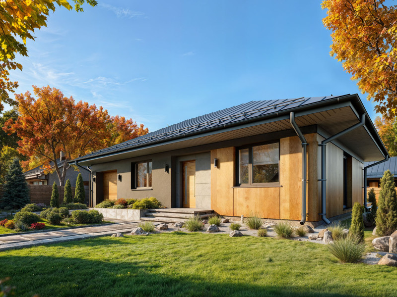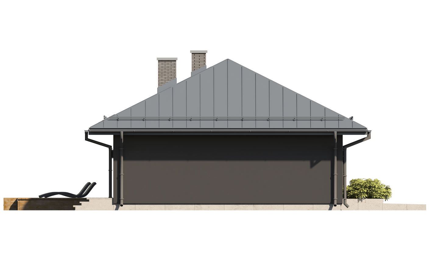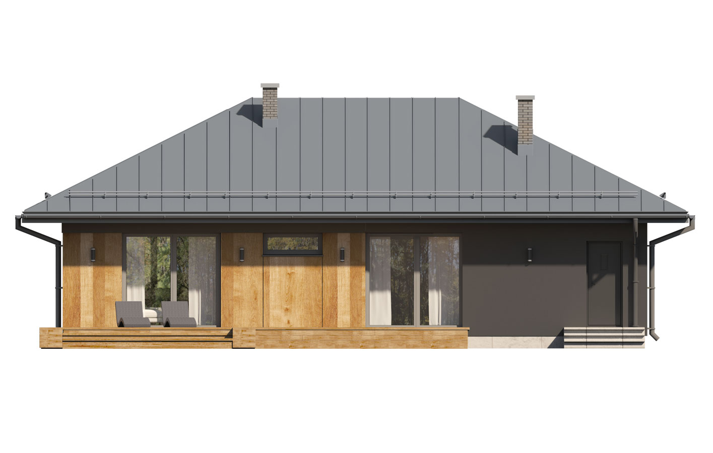 Galia 2 drewniana to niewielki dom parterowy na rzucie prostokąta przykryty kopertowym dachem. Swoim wyglądem zewnętrznym projekt idealnie wpisuje się zarówno w klimat dużych miast, jak i spokojnej wsi. Prostota jego budowy oraz niewielka zwarta bryła przekłada się na niższe koszty budowy oraz na zmniejszenie kosztów późniejszej eksploatacji. Układ funkcjonalny domu został podzielony na 3 strefy. Część dzienną stanowi duża otwarta przestrzeń, w której znajduje się kuchnia, jadalnia, salon oraz wc. Kuchnia wzbogacona została o spiżarnię. W części intymnej znajdują się dwie sypialnie, łazienka oraz przechodnie pomieszczenie gospodarcze, które może pełnić funkcję pralni. Głowna sypialnia posiada własną garderobę. Część gospodarcza domu to garaż i kotłownia. Tak wyraźne podzielenie powierzchni na strefy jest wyjątkowo korzystne w domach o niewielkim metrażu gdzie życie toczy się na jednym poziomie kondygnacji. Atutem projektu jest też możliwość wyjścia na taras z salonu i z głównej sypialni. Galia 2 drewniana to również dom o bardzo ciekawym wyglądzie zewnętrznym, którego charakter został osiągnięty poprzez współczesne ujęcie architektury. Elewacje zaprojektowano na zasadzie kontrastu, gdzie ciemny antracytowy tynk zestawiono z drewnianym płytami elewacyjnymi. Dzięki tradycyjnej bryle, ale i nowoczesnym elewacjom, Galia 2 drewniana może się spodobać zarówno inwestorom poszukującym domu bardziej klasycznego, jak i tym otwartym na współczesne spojrzenie na architekturę.