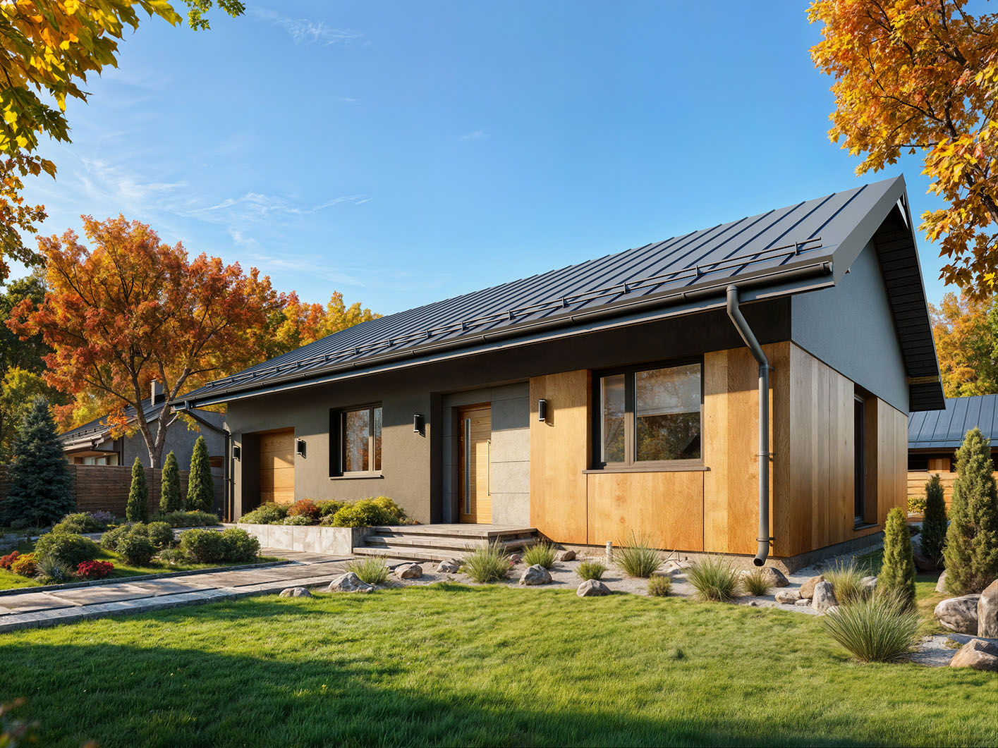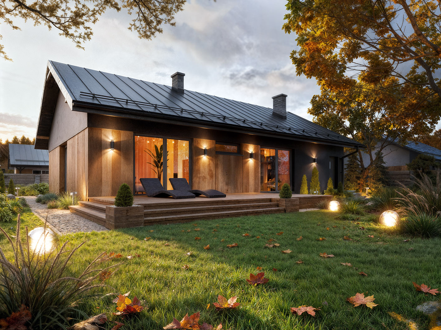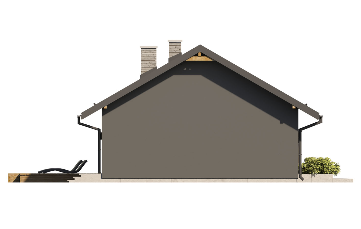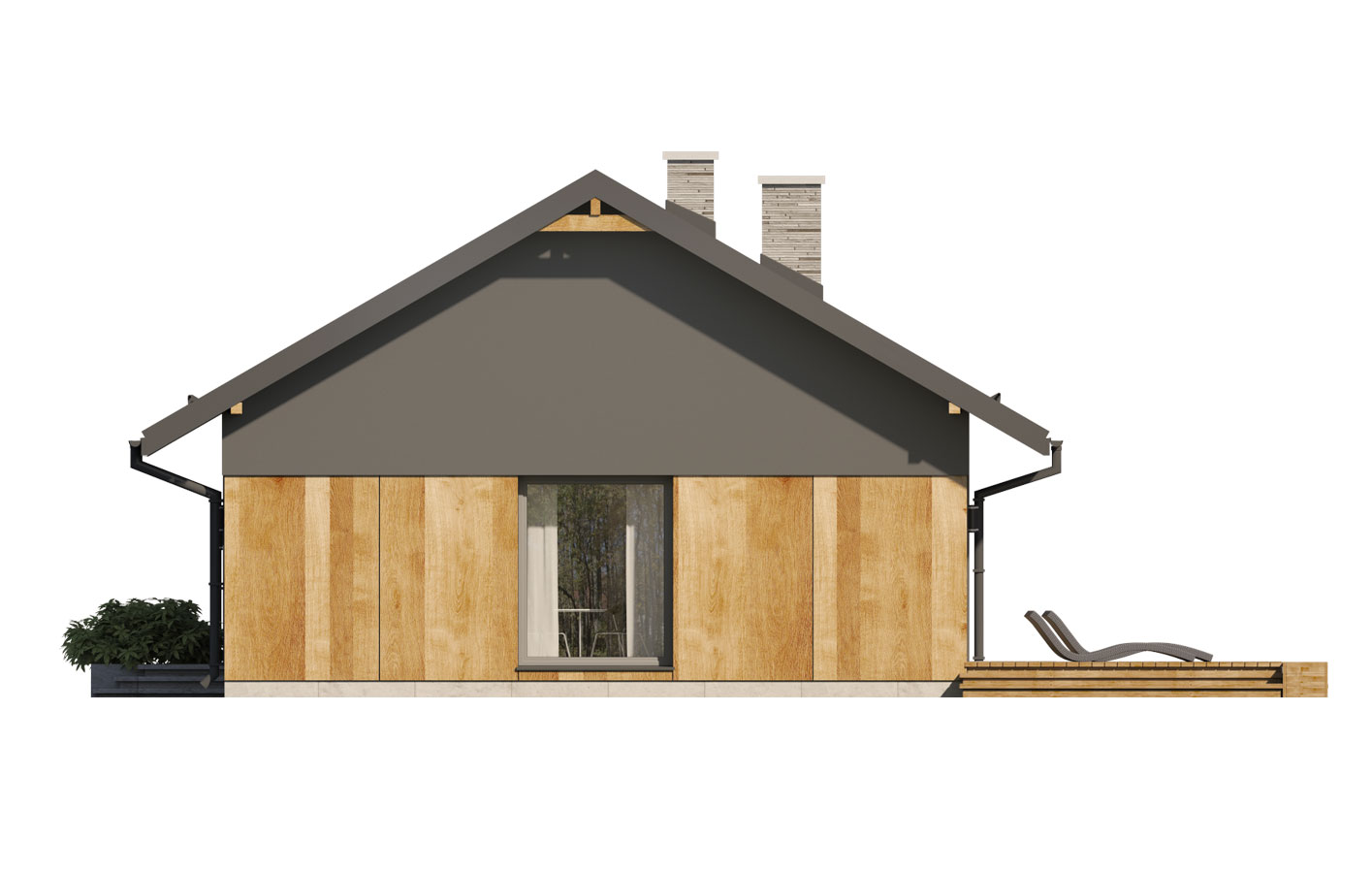 Gaja 4 drewniana to niewielki dom parterowy na rzucie prostokąta przykryty dwuspadowym dachem. Swoim wyglądem zewnętrznym projekt idealnie wpisuje się zarówno w klimat dużych miast, jak i spokojnej wsi. Prostota jego budowy oraz niewielka zwarta bryła przekłada się na niższe koszty budowy oraz na zmniejszenie kosztów późniejszej eksploatacji. Układ funkcjonalny domu został podzielony na 3 strefy. Część dzienną stanowi duża otwarta przestrzeń, w której znajduje się kuchnia, jadalnia, salon oraz wc. Kuchnia wzbogacona została o spiżarnię. W części intymnej znajdują się dwie sypialnie, łazienka oraz przechodnie pomieszczenie gospodarcze, które może pełnić funkcję pralni. Głowna sypialnia posiada własną garderobę. Część gospodarcza domu to garaż i kotłownia. Tak wyraźne podzielenie powierzchni na strefy jest wyjątkowo korzystne w domach o niewielkim metrażu gdzie życie toczy się na jednym poziomie kondygnacji. Atutem projektu jest też możliwość wyjścia na taras z salonu i z głównej sypialni. Gaja 4 drewniana to również dom o bardzo ciekawym wyglądzie zewnętrznych, którego charakter został osiągnięty poprzez współczesne ujęcie architektury. Elewacje zaprojektowano na zasadzie kontrastu, gdzie ciemny antracytowy tynk zestawiono z drewnianym płytami elewacyjnymi. Dzięki tradycyjnej bryle, ale i nowoczesnym elewacjom, Gaja 4 drewniana może się spodobać zarówno inwestorom poszukującym domu bardziej klasycznego, jak i tym otwartym na współczesne spojrzenie na architekturę.