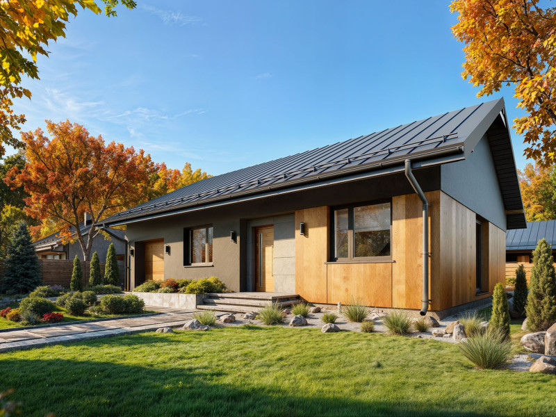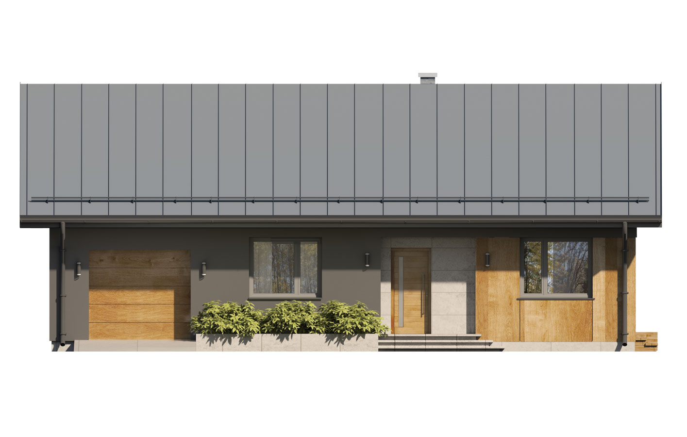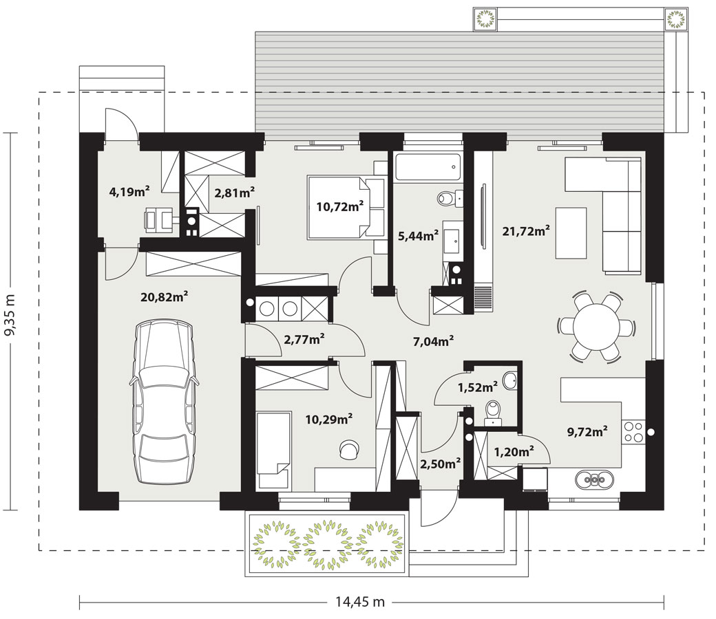 Gaja 4 to niewielki dom parterowy na rzucie prostokąta przykryty dwuspadowym dachem. Swoim wyglądem zewnętrznym projekt idealnie wpisuje się zarówno w klimat dużych miast, jak i spokojnej wsi. Prostota jego budowy oraz niewielka zwarta bryła przekłada się na niższe koszty budowy oraz na zmniejszenie kosztów późniejszej eksploatacji. Układ funkcjonalny domu został podzielony na 3 strefy. Część dzienną stanowi duża otwarta przestrzeń, w której znajduje się kuchnia, jadalnia, salon oraz wc. Kuchnia wzbogacona została o spiżarnię. W części intymnej znajdują się dwie sypialnie, łazienka oraz przechodnie pomieszczenie gospodarcze, które może pełnić funkcję pralni. Głowna sypialnia posiada własną garderobę. Część gospodarcza domu to garaż i kotłownia. Tak wyraźne podzielenie powierzchni na strefy jest wyjątkowo korzystne w domach o niewielkim metrażu gdzie życie toczy się na jednym poziomie kondygnacji. Atutem projektu jest też możliwość wyjścia na taras z salonu i z głównej sypialni. Gaja 4 to również dom o bardzo ciekawym wyglądzie zewnętrznych, którego charakter został osiągnięty poprzez współczesne ujęcie architektury. Elewacje zaprojektowano na zasadzie kontrastu, gdzie ciemny antracytowy tynk zestawiono z drewnianym płytami elewacyjnymi. Dzięki tradycyjnej bryle, ale i nowoczesnym elewacjom, Gaja 4 może się spodobać zarówno inwestorom poszukującym domu bardziej klasycznego, jak i tym otwartym na współczesne spojrzenie na architekturę.