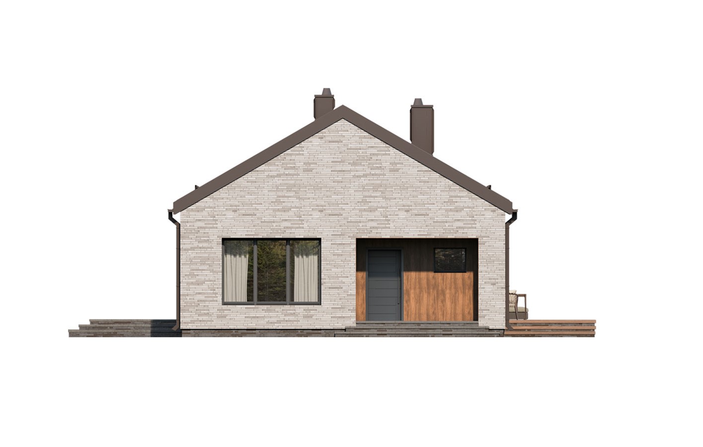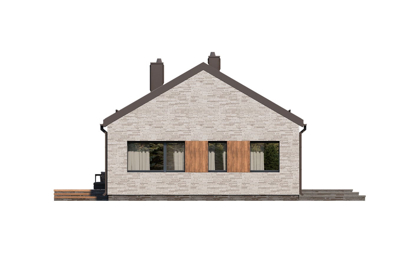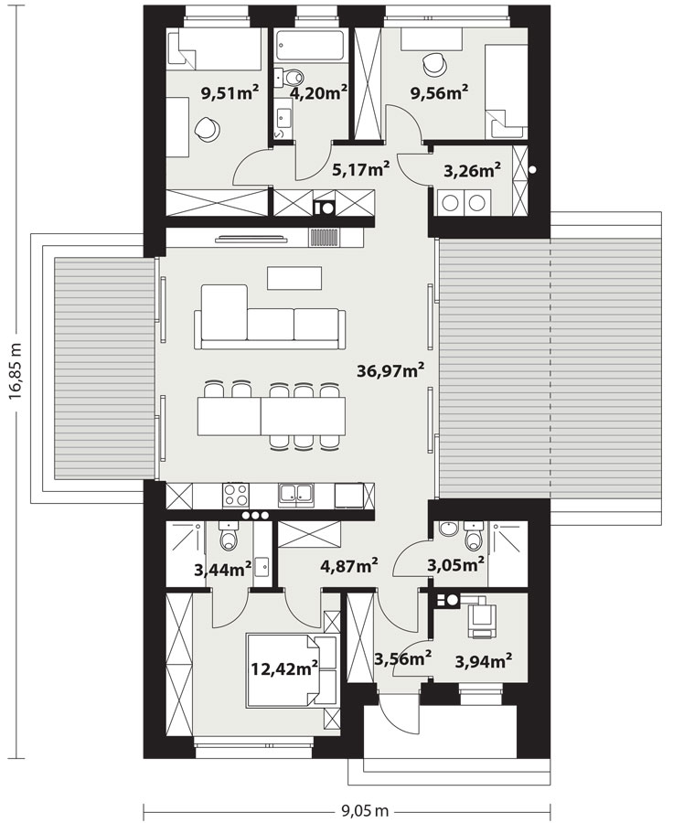 Mati to parterowy dom jednorodzinny w stylu nowoczesnej stodoły o bardzo ciekawej architekturze. Jego centralnym punktem jest całkowicie przeszklona część dzienna. Rozbija ona tę prostą bryłę na rzucie prostokąta przykrytego dwuspadowym dachem. Przestrzeń dzienna nie tylko pozwala na szereg aranżacji wnętrza ale umożliwia także na przenikanie poprzez przeszklenia i tarasy, otaczającej przyrody. Mimo tak ciekawej części dziennej dom charakteryzuje się prostym, funkcjonalnym układem pomieszczeń, który swoim programem zapewnia optymalny komfort 4-osobowej rodzinie. Od frontu budynku przewidziano wiatrołap i hol, kotłownię, łazienkę oraz sypialnię rodziców z łazienką. W strefie nocnej po drugiej stronie budynku zaprojektowano dwie sypialnie dzieci, łazienkę, pralnię oraz długi korytarz z szeregiem szaf. Bryła jest zaprojektowana w delikatnej kolorystyce - jasnoszara płytka elewacyjna i szalówka w naturalnym kolorze drewna. W domu Mati idealnie połączono prostą, bryłę z przyciągającym uwagę otwarciem w części dziennej, co może się spodobać zarówno inwestorom poszukującym domu bardziej klasycznego jak i tym otwartym na współczesne spojrzenie na architekturę.
