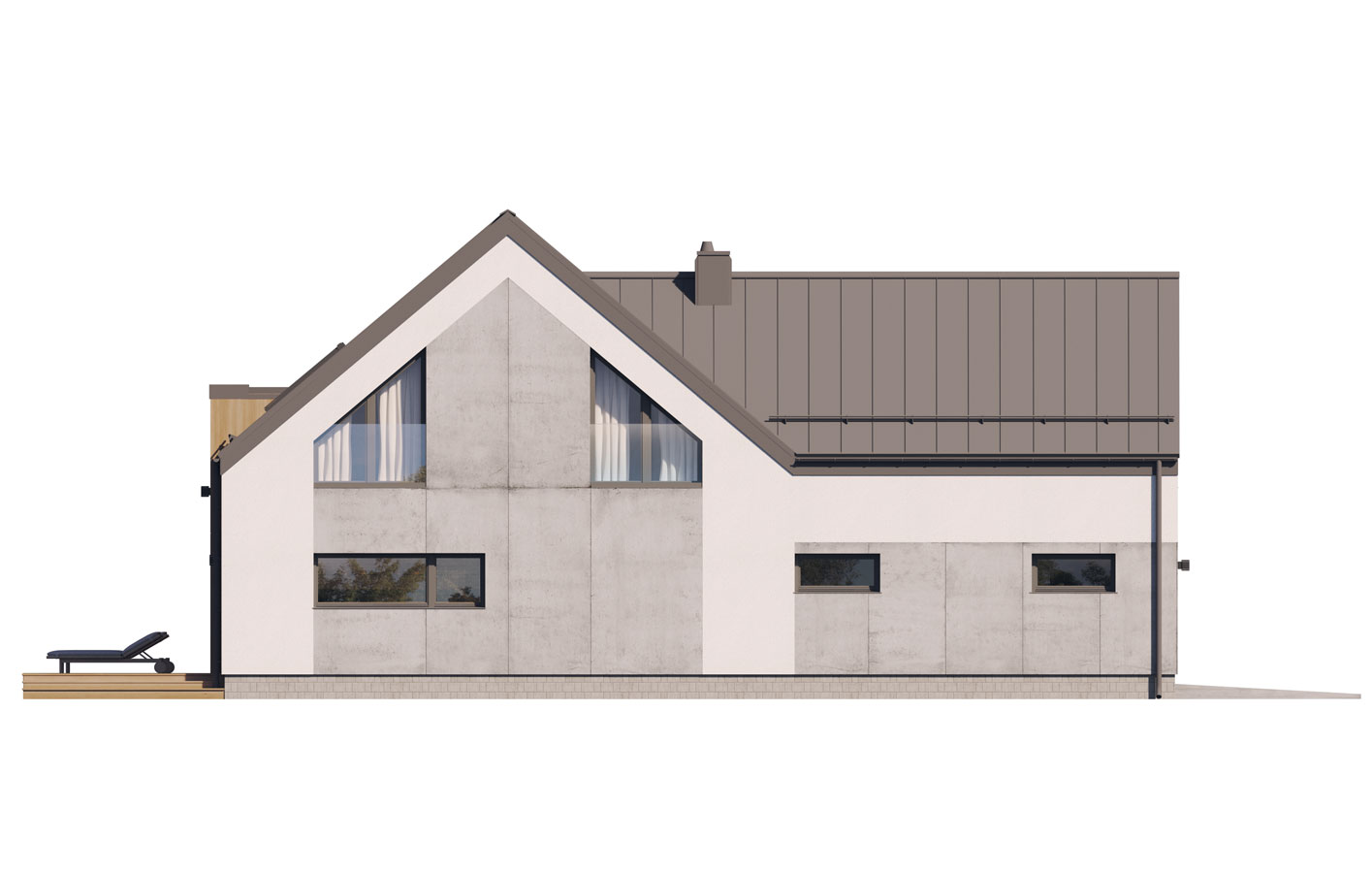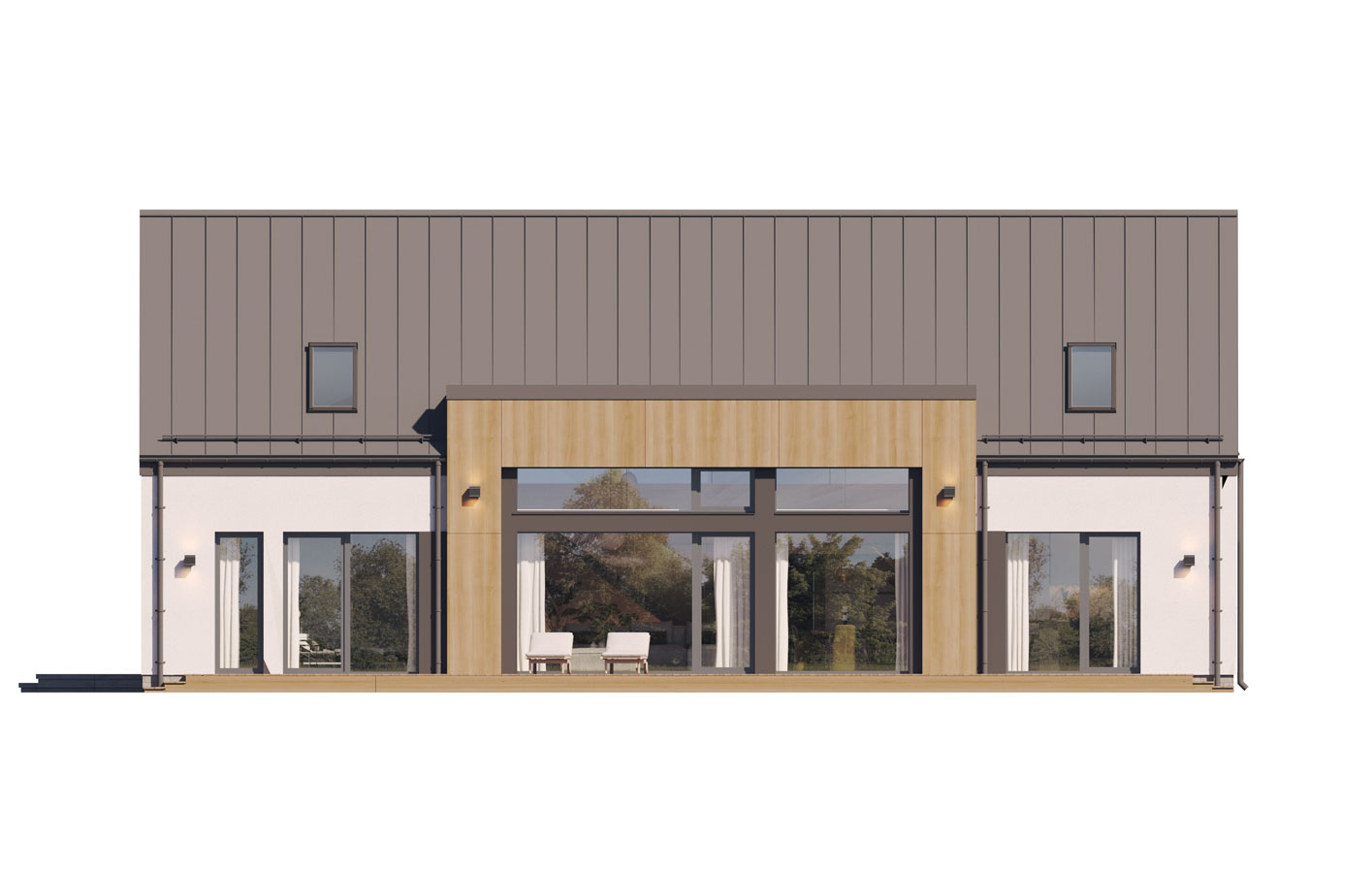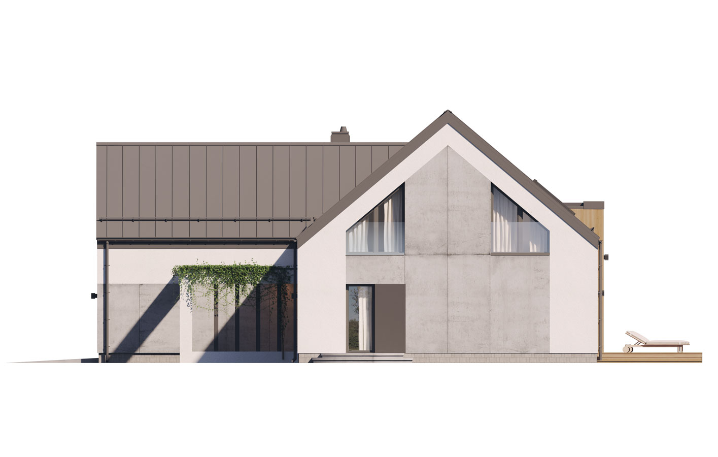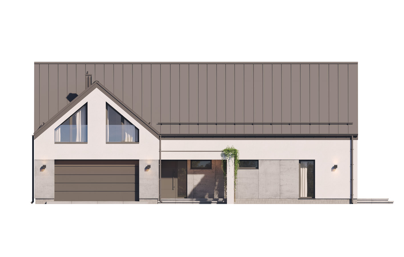 Dom Kampinos to ciekawa propozycja dla inwestorów ceniących współczesne spojrzenie na architekturę. Projekt ma bardzo interesującą aranżację zewnętrzną i swoim charakterem nawiązuje do stylu nowoczesnej stodoły. Bryła domu, usytuowana jest na planie litery L i przykryta dwuspadowym dachem. Nowoczesną stylistykę podkreśla dodatkowo ogromne przeszklenie w części dziennej oraz podwyższony salon z antresolą. We wnętrzu zachowano bardzo przejrzysty i funkcjonalny program użytkowy dla 4-6 osobowej rodziny. Część dzienna to przestronny salon z jadalnią oraz kuchnia i spiżarnia. Kuchnia może pozostać otwarta a można ją też zamknąć. Strefa intymna składa się z 3 sypialni i gabinetu na poddaszu oraz dużej sypialni z garderobą na parterze. Część gospodarcza to dwustanowiskowy garaż i kotłownia. Niewątpliwym atutem projektu jest zastosowanie dużego tarasu oraz licznych przeszkleń z możliwością wyjścia na taras zarówno z salonu jak i z kuchni i sypialni. Dom standardowo wyposażony w rekuperację.