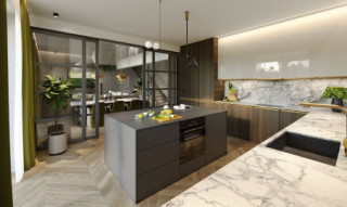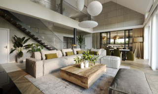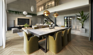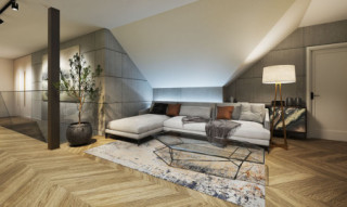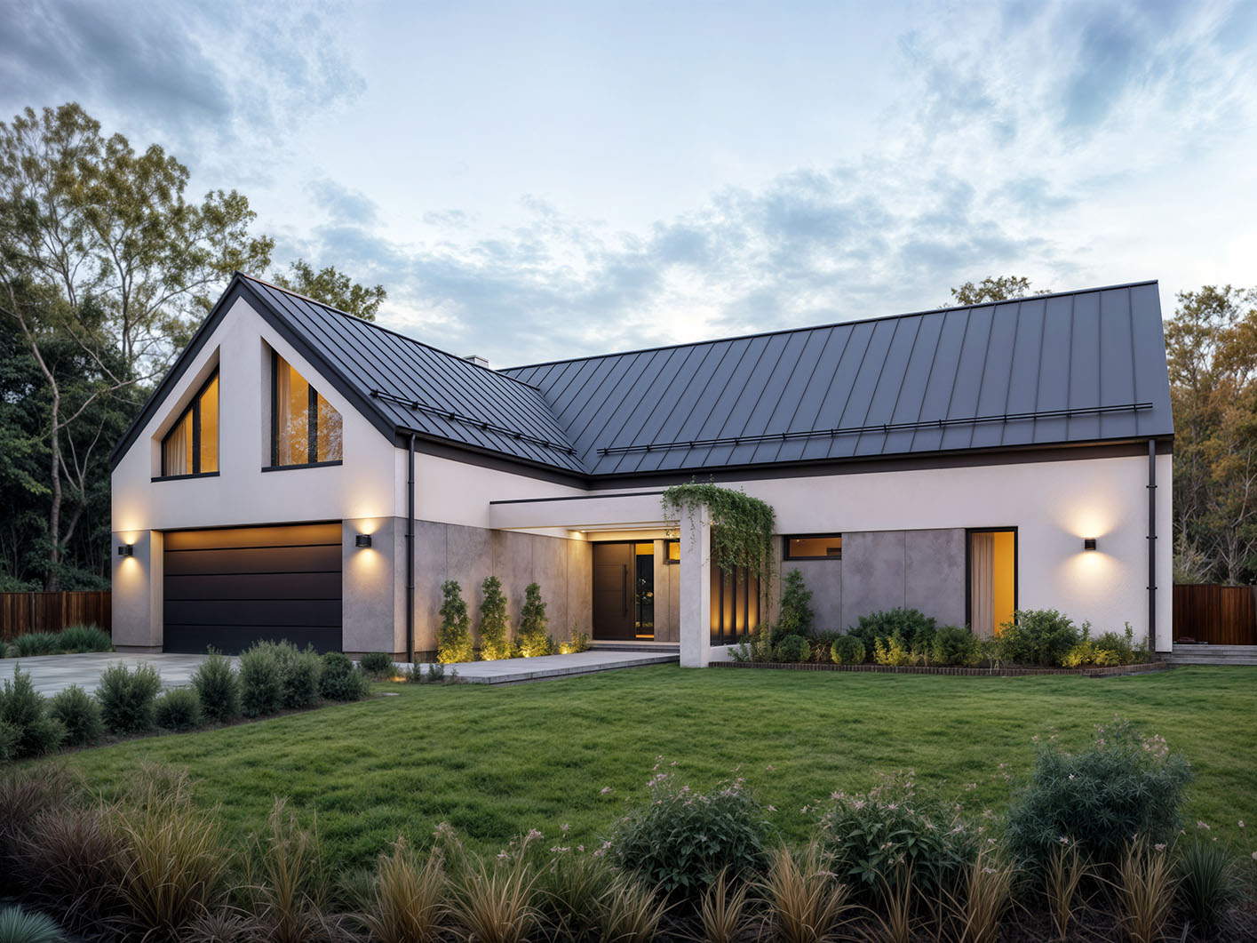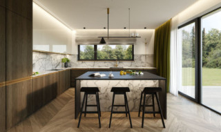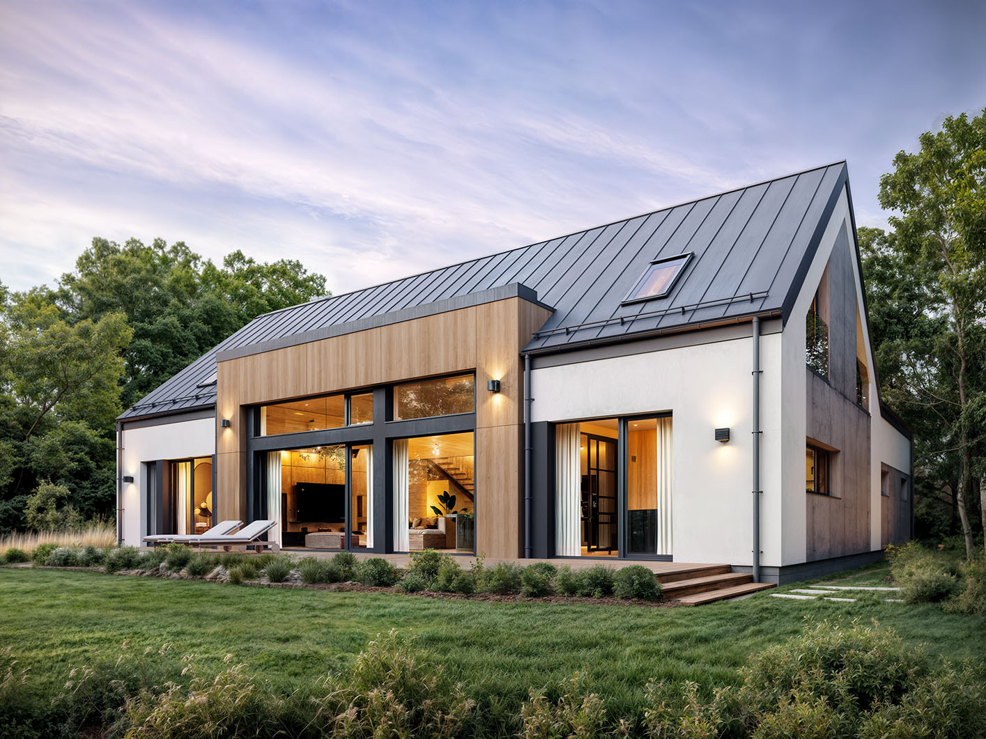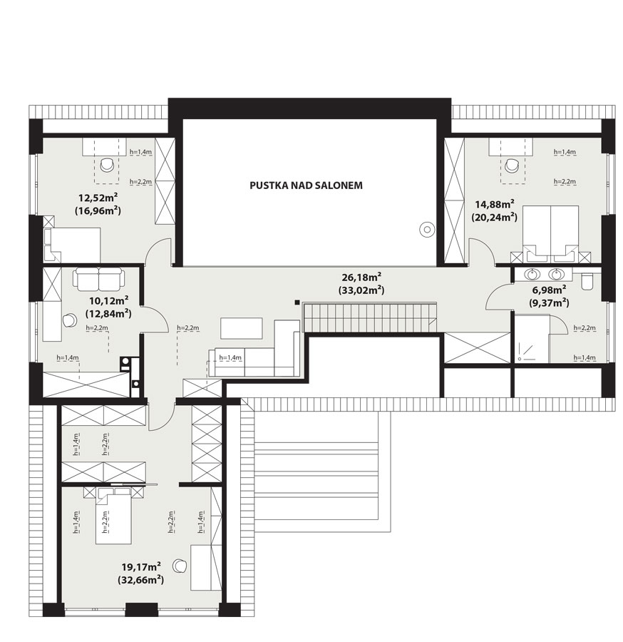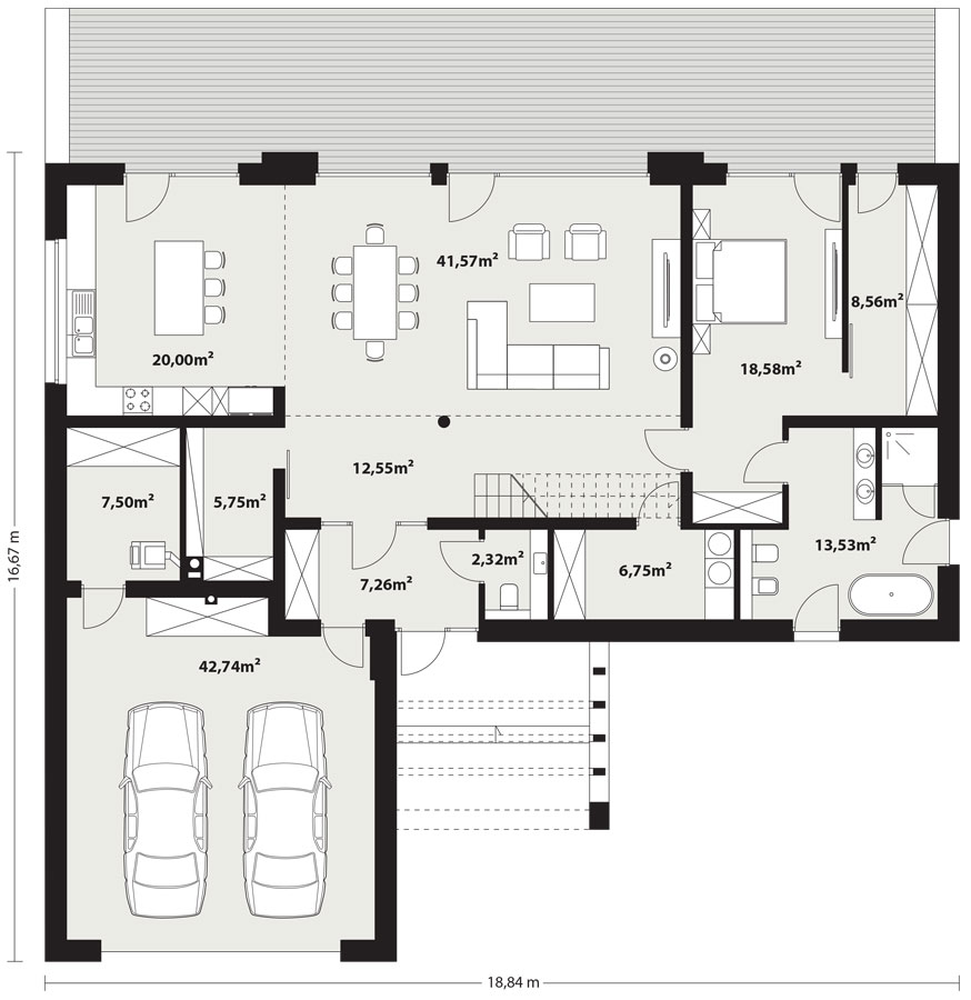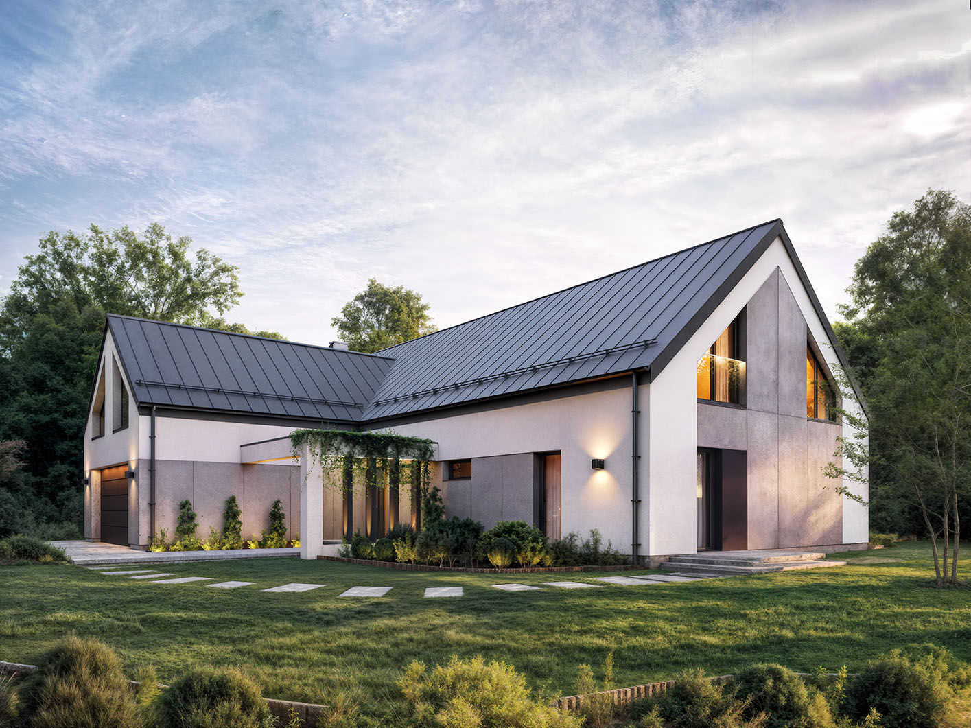 Dom Kampinos to ciekawa propozycja dla inwestorów ceniących współczesne spojrzenie na architekturę. Projekt ma bardzo interesującą aranżację zewnętrzną i swoim charakterem nawiązuje do stylu nowoczesnej stodoły. Bryła domu, usytuowana jest na planie litery L i przykryta dwuspadowym dachem. Nowoczesną stylistykę podkreśla dodatkowo ogromne przeszklenie w części dziennej oraz podwyższony salon z antresolą. We wnętrzu zachowano bardzo przejrzysty i funkcjonalny program użytkowy dla 4-6 osobowej rodziny. Część dzienna to przestronny salon z jadalnią oraz kuchnia i spiżarnia. Kuchnia może pozostać otwarta a można ją też zamknąć. Strefa intymna składa się z 3 sypialni i gabinetu na poddaszu oraz dużej sypialni z garderobą na parterze. Część gospodarcza to dwustanowiskowy garaż i kotłownia. Niewątpliwym atutem projektu jest zastosowanie dużego tarasu oraz licznych przeszkleń z możliwością wyjścia na taras zarówno z salonu jak i z kuchni i sypialni. Dom standardowo wyposażony w rekuperację.