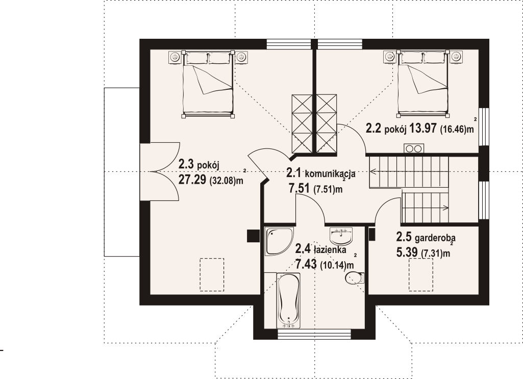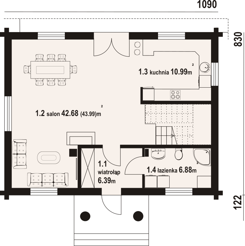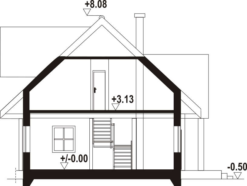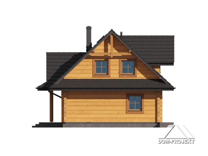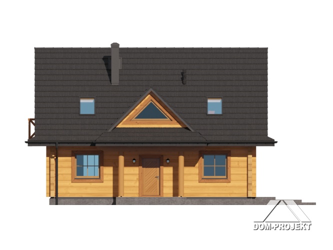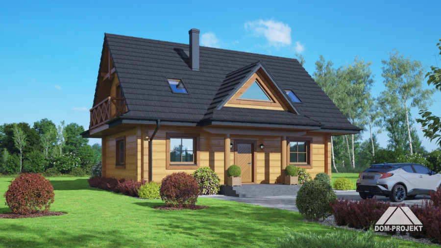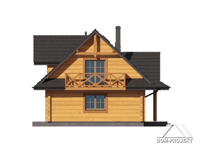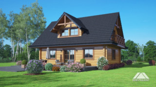 Projekt domu z bali inspirowany architekturą góralską. Wygodny, funkcjonalny, ekologiczny. Ogrzewany pompą ciepła i kominkiem. Na parterze strefa dzienna z bardzo dużym salonem, jadalnią i częściowo otwartą kuchnią. Program użytkowy uzupełnia łazienka z miejscem na pralkę i suszarkę oraz wiatrołap. Na poddaszu dwie duże sypialnie, wspólna łazienka i garderoba. Zwarta bryła budynku i dach dwuspadowy sprzyjają szybkiej i taniej budowie i niskim kosztom eksploatacji.