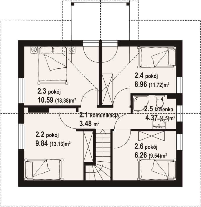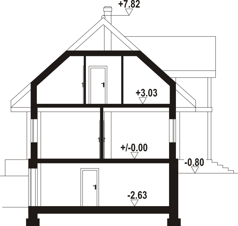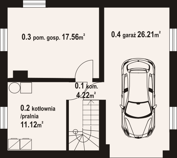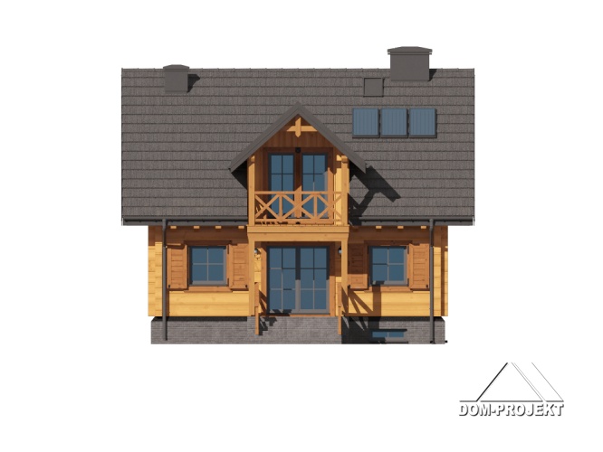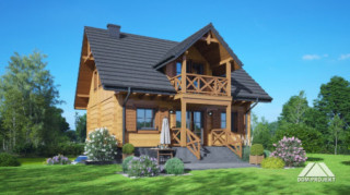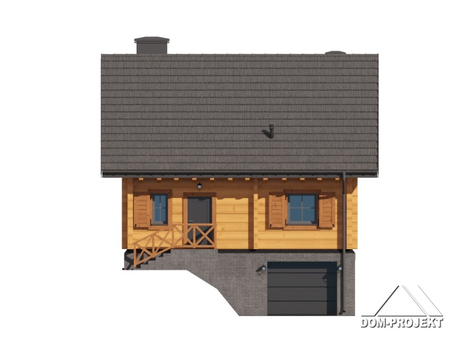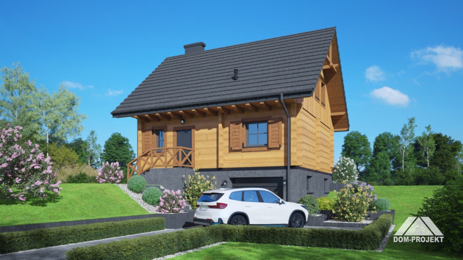 Projekt wygodnego, praktycznego i szybkiego w budowie domu z bali, idealny na działkę za spadkiem terenu. Na parterze strefa dzienna, a w niej duży salon z kominkiem i wyjściem na taras oraz aneks kuchenny. Dodatkowo pokój, wc i łazienka. Na poddaszu cztery wygodne pokoje i wspólna łazienka. Budynek jest całkowicie podpiwniczony, a w piwnicy przewidzieliśmy garaż, pralnię oraz pomieszczenie gospodarcze.