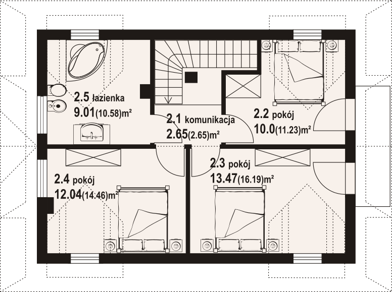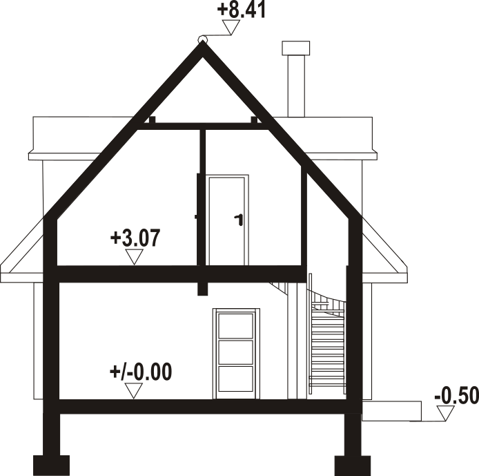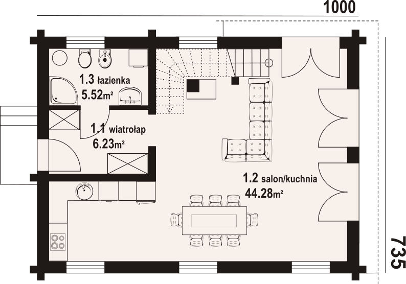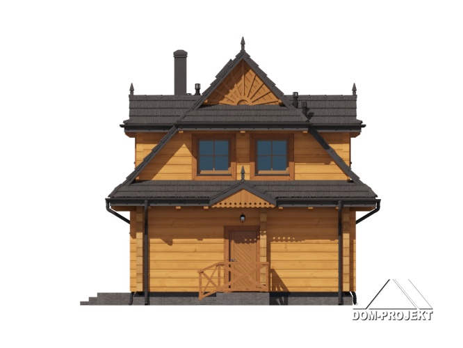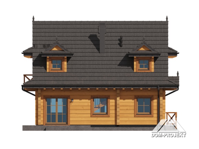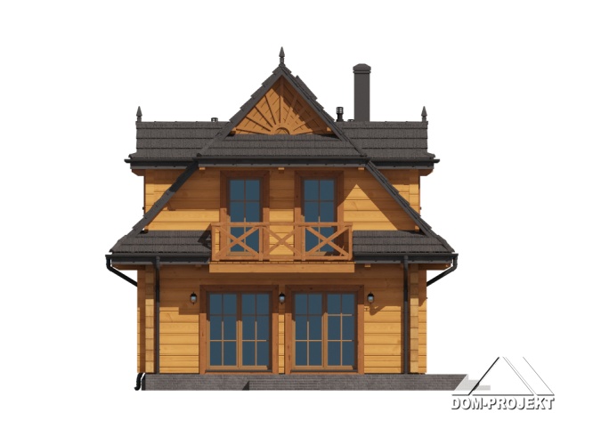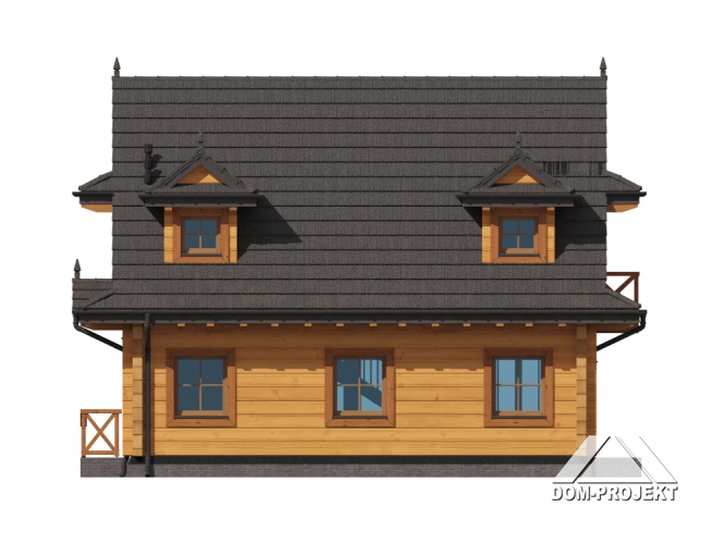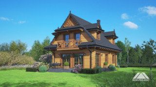 Projekt przytulnego, wygodnego domu z bali, inspirowany stylem zakopiańskim. Na parterze bardzo dobrze doświetlona strefa dzienna - salon z kominkiem i kuchnia z jadalnią. Program użytkowy uzupełnia łazienka i wiatrołap. Na poddaszu trzy wygodne, przestronne sypialnie oraz wspólna łazienka. Dwa pokoje mają dostęp do balkonu.