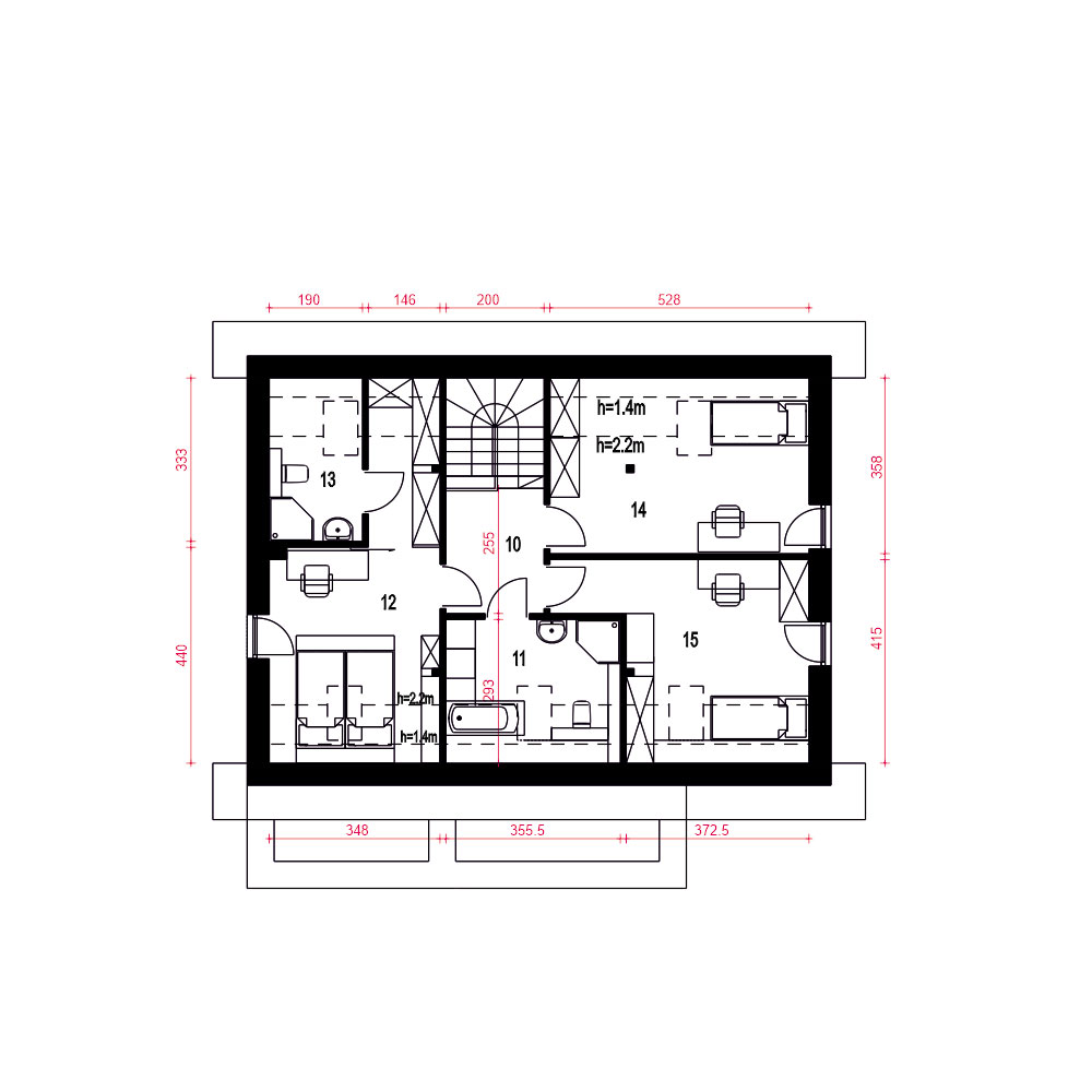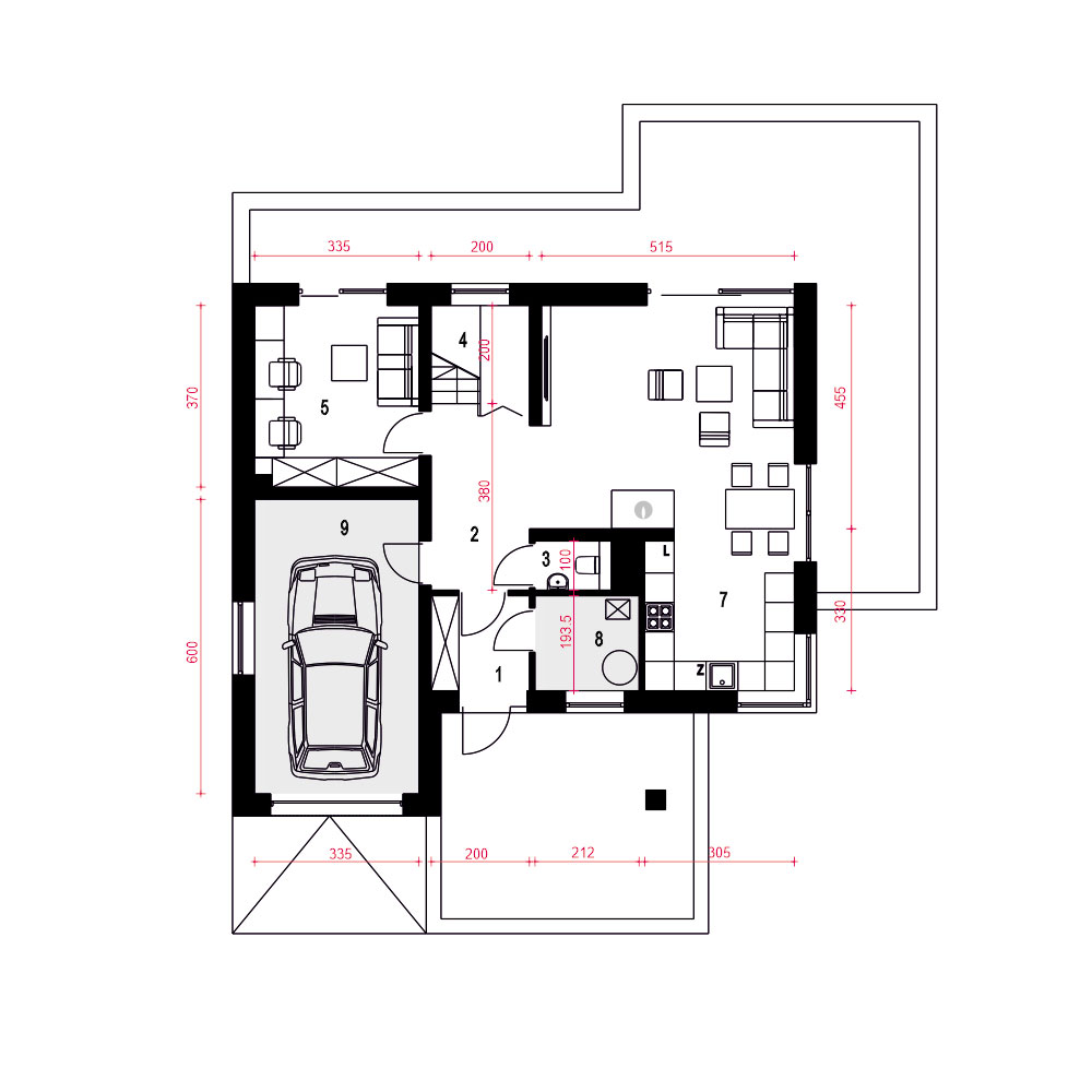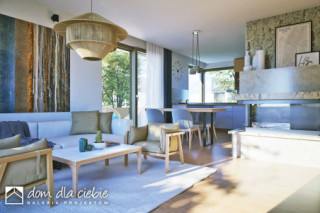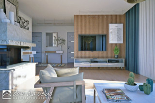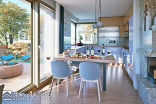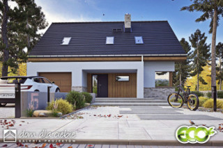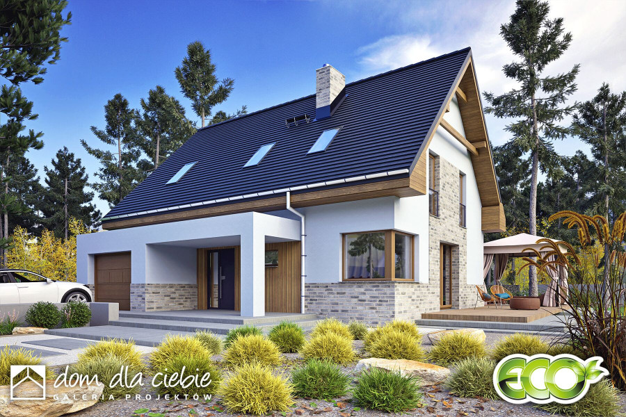 Karla to nowoczesny i funkcjonalny projekt domu jednorodzinnego z poddaszem użytkowym, przeznaczony dla 4–5-osobowej rodziny. Zwarta bryła, dwuspadowy dach i stonowana elewacja z jasnego tynku i klinkieru łączą elegancję z ekonomią budowy. Zadaszone wejście podkreśla prostą, nowoczesną formę. Na parterze zaplanowano przestronną strefę dzienną z salonem, jadalnią i kuchnią oraz kominkiem w centralnym punkcie. Dodatkowy pokój może pełnić funkcję gabinetu lub sypialni gościnnej. Przewidziano też WC, garderobę pod schodami oraz dostęp do garażu i pomieszczenia technicznego. Poddasze to trzy sypialnie, w tym jedna z własną łazienką, oraz wspólna, przestronna łazienka z wanną i prysznicem. Projekt Karla harmonijnie łączy nowoczesność z naturalnymi akcentami. Dzięki dużym przeszkleniom wnętrza są jasne i otwarte na ogród, a prosta forma budynku pasuje zarówno do krajobrazu wiejskiego, jak i podmiejskiego.fundamenty: BETONOWE ściany zewnętrzne: POROTHERM+STYROPIAN TERMO ORGANIKA ściany wewnętrzne: POROTHERM rodzaj stropu: TERIVA elewacje: TYNK STRUKTURALNY, KLINKIER pokrycie dachu: DACHÓWKA CERAMICZNA