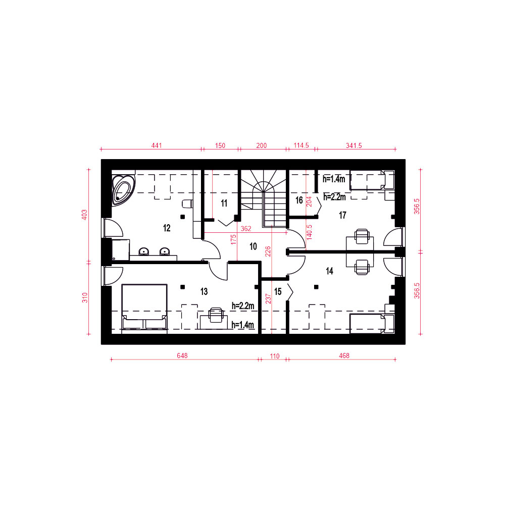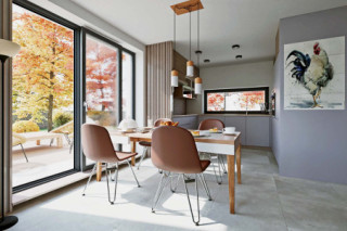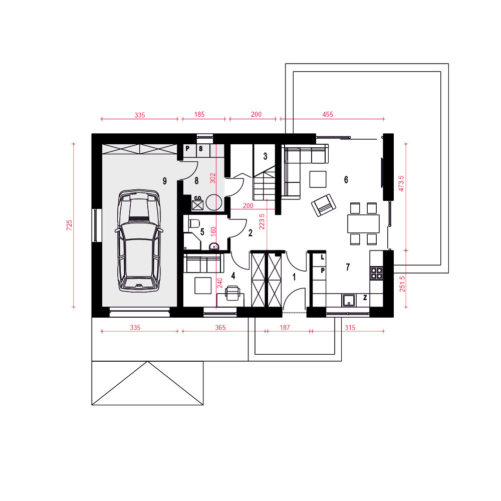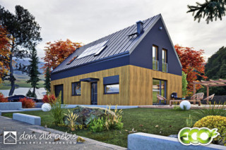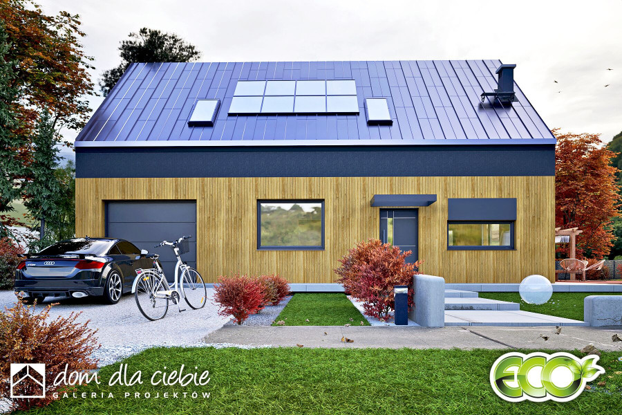 Hazi z garażem to nowoczesny, kompaktowy dom jednorodzinny z dwuspadowym dachem bez okapów, przeznaczony dla 4-osobowej rodziny. Prosta i elegancka bryła łączy estetykę współczesnej architektury z funkcjonalnością. Na parterze znajduje się przestronny salon z otwartą kuchnią i jadalnią, dodatkowy pokój (np. gabinet lub sypialnia), łazienka z prysznicem, pomieszczenie techniczne oraz garaż. Duże przeszklenia łączą wnętrze z ogrodem i tarasem, tworząc przyjazną przestrzeń do wypoczynku. Na poddaszu zaplanowano trzy sypialnie (dwie z garderobami) oraz łazienkę. Hazi to dom ekologiczny, łatwy w budowie i ekonomiczny w użytkowaniu – idealny dla rodzin ceniących wygodę, nowoczesność i rozsądne koszty.