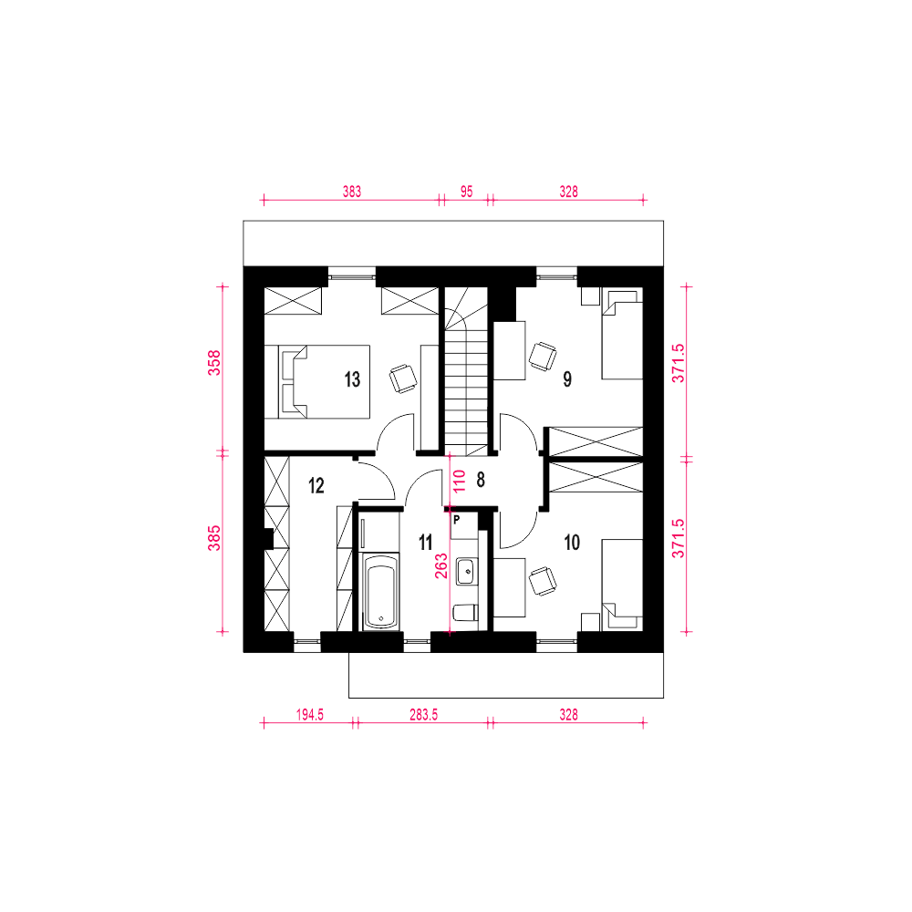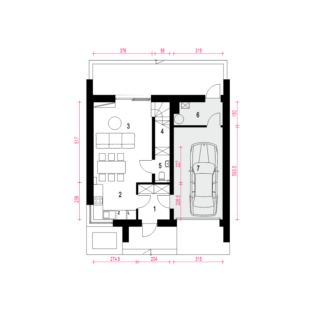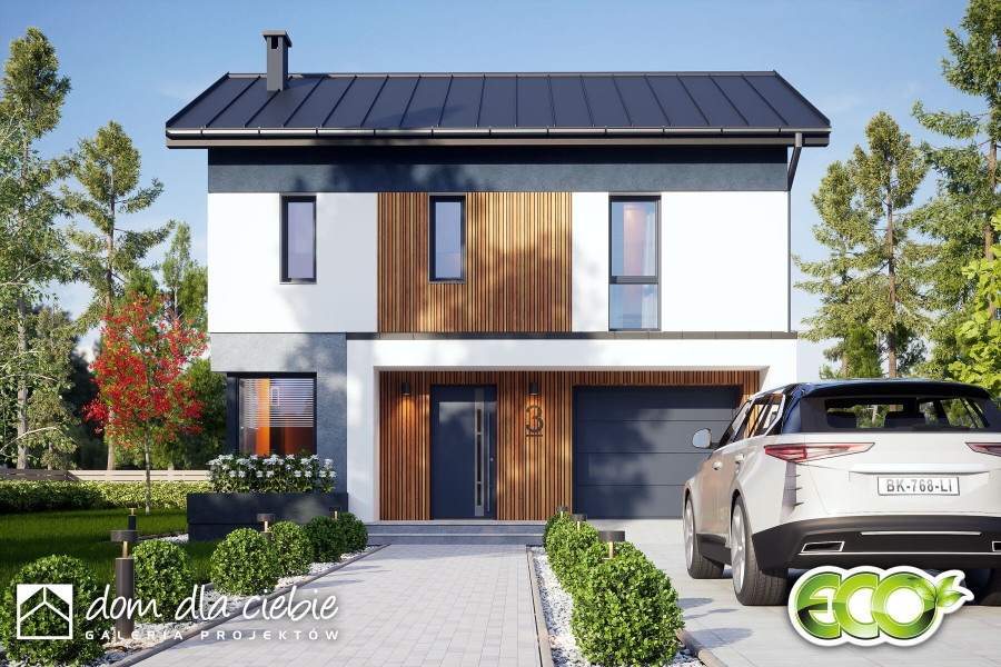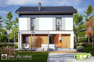 Projekt domu Gaja to nowoczesny piętrowy budynek z dwuspadowym dachem, idealny dla 4-osobowej rodziny. Parter obejmuje przestronny salon z jadalnią i otwartą kuchnią, wzbogacony dużymi drzwiami tarasowymi, które prowadzą na częściowo zadaszony taras. Kuchnia zyskała dodatkowe oświetlenie dzięki dużemu oknu narożnemu. Wejście do domu oraz wjazd do jednostanowiskowego garażu są osłonięte daszkiem. Na piętrze znajdują się trzy sypialnie, obszerna garderoba i funkcjonalna łazienka. Przechodnia kotłownia, dostępna z garażu, umożliwia wygodne wyjście do ogrodu. Konstrukcja dachu zaprojektowana jest z prefabrykowanych wiązach Mitek. Gaja to harmonijny, ponadczasowy dom o wyważonej estetyce, doskonały do miejskiej zabudowy.fundamenty: BETONOWE ściany zewnętrzne: POROTHERM+STYROPIAN TERMO ORGANIKA strop na parterem: TERIVA strop nad piętrem i konstrukcja dachu: wiązary prefabrykowane MITEK elewacje: TYNK STRUKTURALNY pokrycie dachu: DACHÓWKA CERAMICZNA