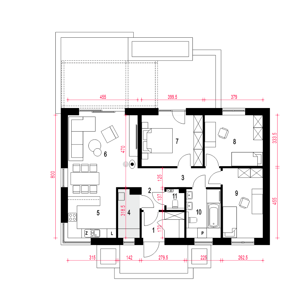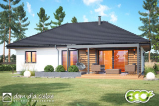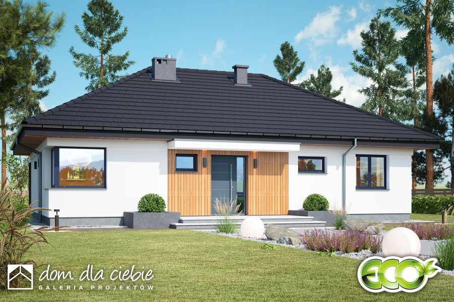 Projekt domu Pieris bez garażu to zwarty, nowoczesny dom parterowy dla 4-osobowej rodziny. Zaprojektowany w technologii murowanej z prefabrykowaną więźbą dachową, przykryty jest eleganckim stromym dachem kopertowym. Projekt Pieris oferuje funkcjonalny układ parteru, łącząc strefę dzienną i nocną na jednym poziomie. Przy wejściu przewidziano praktyczny wiatrołap z garderobą, hol, toaletę oraz pomieszczenie techniczne ze spiżarnią. W strefie dziennej zaprojektowano jasny i przestronny salon z miejscem na duży stół jadalniany i widokiem na ogród. Duże drzwi tarasowe prowadzą stąd bezpośrednio na taras zewnętrzny. Obok znajduje się wygodna kuchnia z półwyspem i meblami w układzie litery „U”, zapewniająca dużo miejsca do pracy i idealne doświetlenie dużym oknem narożnym. Do strefy prywatnej prowadzi korytarz z holu wejściowego. Znajdują się tam trzy wygodne sypialnie oraz wspólna łazienka z wanną i prysznicem. Pieris to atrakcyjny, energooszczędny dom parterowy o współczesnej bryle – należy do serii „eco”, jest ekonomiczny w budowie i eksploatacji, stanowi doskonałą propozycję na pierwszy dom dla czteroosobowej rodziny.fundamenty: BETONOWE ściany zewnętrzne: POROTHERM+STYROPIAN TERMO ORGANIKA rodzaj stropu i konstrukcja dachu: wiązary prefabrykowane: MITEK elewacje: TYNK STRUKTURALNY pokrycie dachu: DACHÓWKA CEM. lub CER.