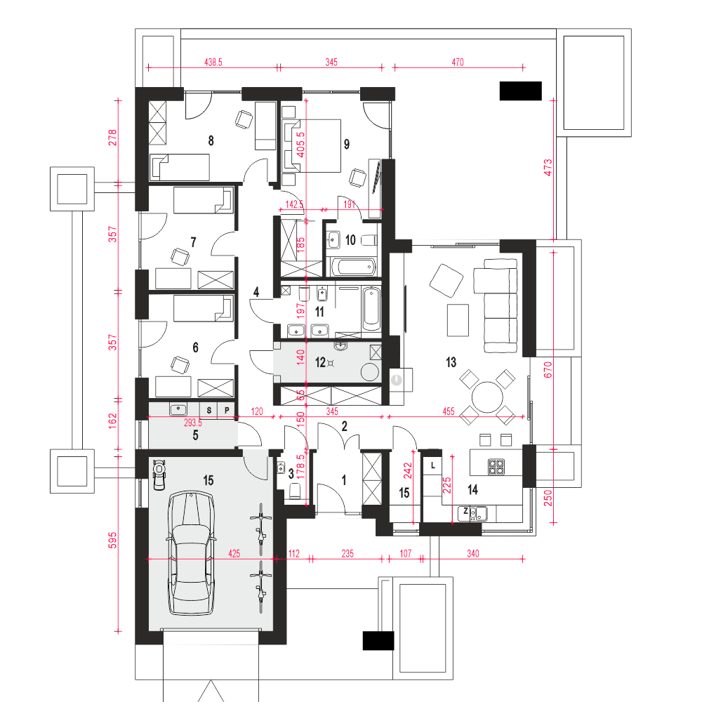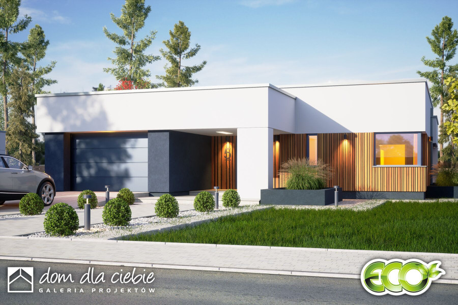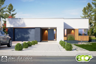 Projekt domu parterowego Klara VIII z garażem to idealna propozycja dla 5-osobowej rodziny. Dom zaprojektowany jest w technologii murowanej jako przekryty płaskim dachem. Klara VIII to funkcjonalny projekt domu parterowego, łączący strefę ogólnodostępną i prywatną na jednej kondygnacji. Projekt jest opracowany w oparciu o projekt Klara V, względem którego różni sie sposobem przekrycia budynku. W części wejściowej mamy zaprojektowany wygodny wiatrołap i hol z szafami wnękowymi, pralnię oraz toaletę. W części ogólnodostępnej przewidziano przestronny i dobrze doświetlony salon z miejscem na wygodny stół jadalniany, z widokiem na ogród. Dzięki dużym drzwiom tarasowym od strony ogrodowej, dostaniemy się wprost na taras zewnętrzny. W strefie ogólnodostępnej projekt przewiduje również wygodną kuchnię z wyspą i praktyczną spiżarnią. Kuchnia z układem mebli w kształcie litery "L", zapewnia wygodną przestrzeń do pracy, a duże frontowe okno doświetla idealnie przestrzeń roboczą. Do części prywatnej domu dostaniemy się przez korytarz dostępny z holu wejściowego. W części prywatnej mamy zaprojektowane cztery pokoje sypialne, w tym jeden typu master bedroom. Znajdziemy tu też wygodną, wspólną łazienkę z wanną oraz pomieszczenie techniczne z piecem CO. Klara VIII to atrakcyjna propozycja domu energooszczędnego, o nowoczesnym wyglądzie. To projekt domu z serii "eco" - ekonomiczny w budowie i w utrzymaniu - idealna propozycja dla rodzin planujących budowę pierwszego domu.fundamenty: BETONOWE ściany zewnętrzne: POROTHERM+STYROPIAN TERMO ORGANIKA rodzaj stropu: TERIVA I elewacje: TYNK STRUKTURALNY pokrycie dachu: MEMBRANA EPDM
