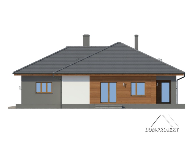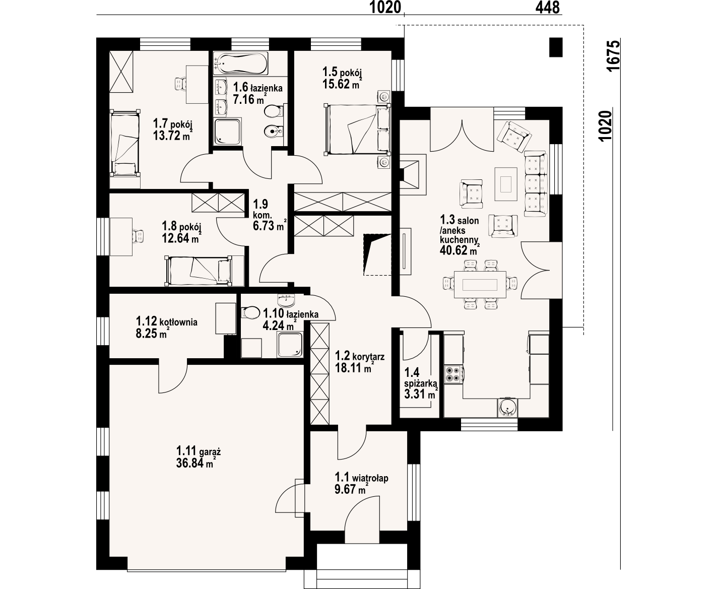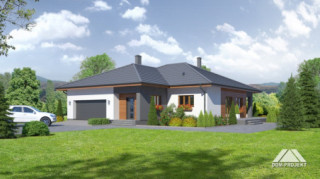 Dom parterowy. Duży salon z aneksem kuchennym, kominkiem i wyjściami na taras. Trzy pokoje, dwie łazienki, korytarz, wiatrołap, garaż na dwa samochody, kotłownia. Poddasze nieużytkowe z możliwością wykorzystania na strych lub cele gospodarcze.