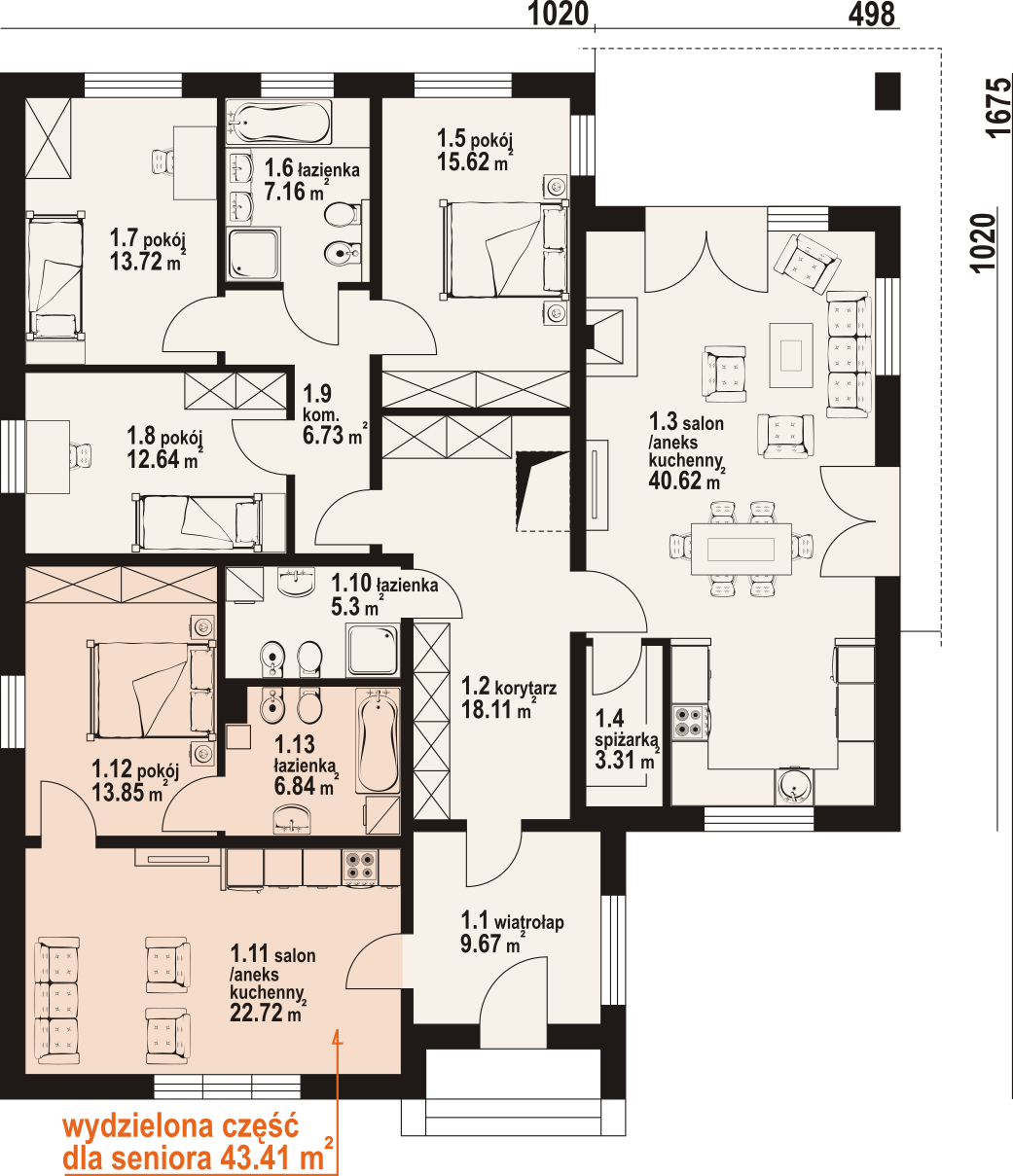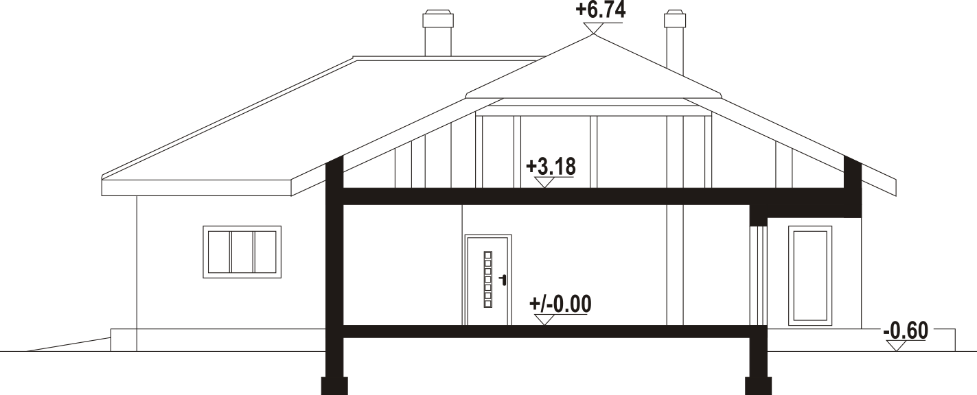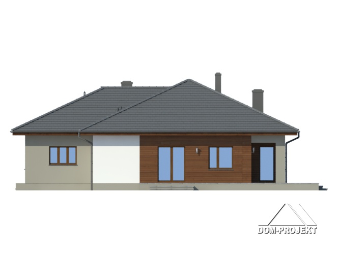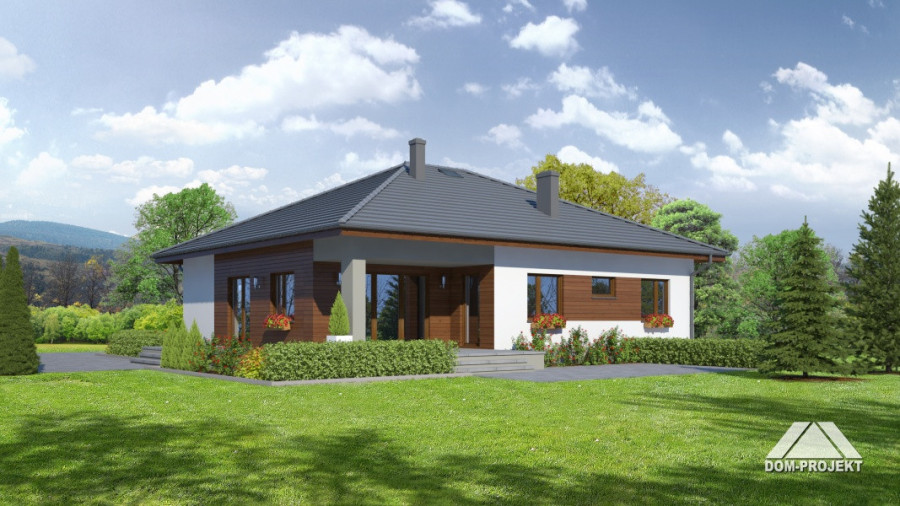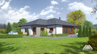 Dom parterowy z wydzieloną dodatkową częścią mieszkalną dla seniora . Duży salon z aneksem kuchennym, kominkiem i wyjściami na taras. Trzy pokoje, dwie łazienki, korytarz i wiatrołap oraz pomieszczenia dla seniora (salon z aneksem kuchennym, pokój, łazienka). Poddasze nieużytkowe z możliwością wykorzystania na strych lub cele gospodarcze.