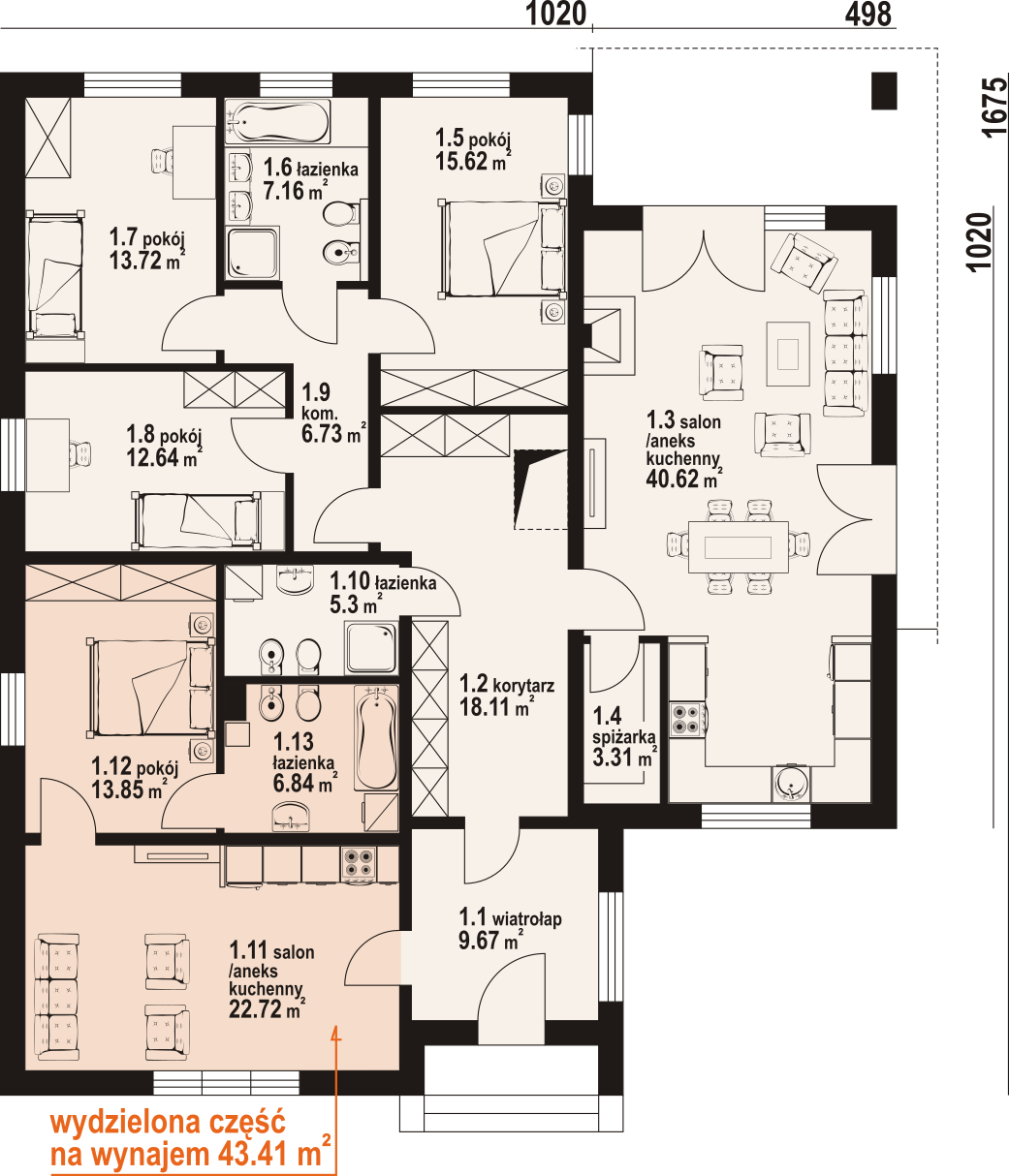 Dom parterowy z wydzieloną dodatkową częścią mieszkalną przeznaczoną pod wynajem. Duży salon z aneksem kuchennym, kominkiem i wyjściami na taras. Trzy pokoje, dwie łazienki, korytarz i wiatrołap oraz pomieszczenia pod wynajem (salon z aneksem kuchennym, pokój, łazienka). Poddasze nieużytkowe z możliwością wykorzystania na strych lub cele gospodarcze.