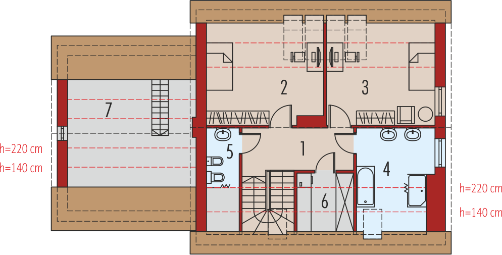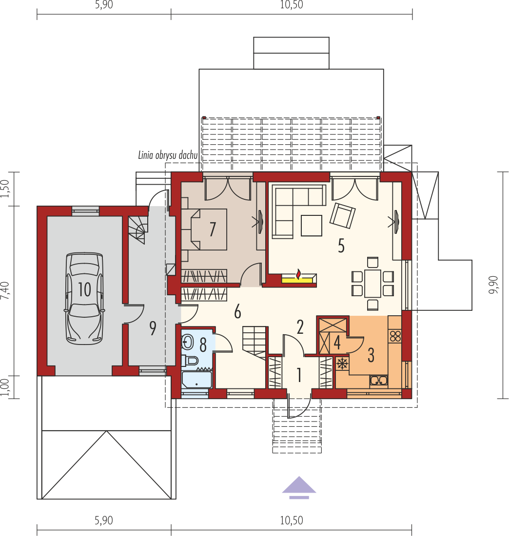 Charakterystyka: dom parterowy z poddaszem użytkowym, niepodpiwniczony, z garażem jednostanowiskowymPrzeznaczenie: dom dla 3-4-osobowej rodzinyTechnologia i konstrukcja:Fundamenty: ławy, bloczki betonowe 24 cm, ocieplenie styropian 15 cmŚciany zewnętrzne: murowane, dwuwarstwowe, cegła ceramiczna poryzowana 24 cm, ocieplenie wełna mineralna 20 cmŚciany wewnętrzne: murowane, cegła ceramiczna poryzowana, ściany nośne 18 i 24 cm, ścianki działowe 12 cmPodłoga na gruncie: płyta betonowa, ocieplenie styropian 15 cmStrop: strop międzypiętrowy gęstożebrowy Teriva, stropodach: ocieplenie styropian 30 cmDach: konstrukcja drewniana, ocieplenie wełna mineralna 30 cm, dachówka płaska lub inna o podobnych parametrachRozwiązania instalacyjne: Ogrzewanie: kocioł gazowy, rozprowadzenie ciepła: grzejniki Wentylacja: grawitacyjna Wykończenie:Elewacja: tynk cienkowarstwowy mineralny, okładzina drewnianaStolarka: drewniana, PCV lub aluminiowa, rolety zewnętrzne w systemie CleverBox firmy BeCleverOkna połaciowe: rozwiązania technologiczne firmy FakroInne: ażurowa pergola drewnianaDostępne wersje- Odbicie lustrzaneIstnieje możliwość- podpiwniczenia budynkuAtuty projektu okiem architekta- Zwarta bryła budynku sprzyjająca energooszczędności- Znakomite parametry cieplne- Funkcjonalne i ergonomiczne wnętrze- Kuchnia z praktyczną spiżarnią- Reprezentacyjny salon z kominkiem- Wygodna strefa nocna z dużym pokojem kąpielowym i dodatkową toaletą- Duże przeszklenia od strony ogrodu oraz w jadalni z widokiem na ogród- Ażurowa pergola jako dodatkowa osłona przed przegrzewaniem w upalne dni- Ażurowe, dekoracyjne zadaszenie nad wejściem do budynku- Garaż oddzielony termicznie od ogrzewanej części budynku- Przestronna strefa gospodarcza: pomieszczenie kotłowni i strych- Duże pomieszczenie kotłowni pozwala na zastosowanie dowolnego źródła ogrzewania