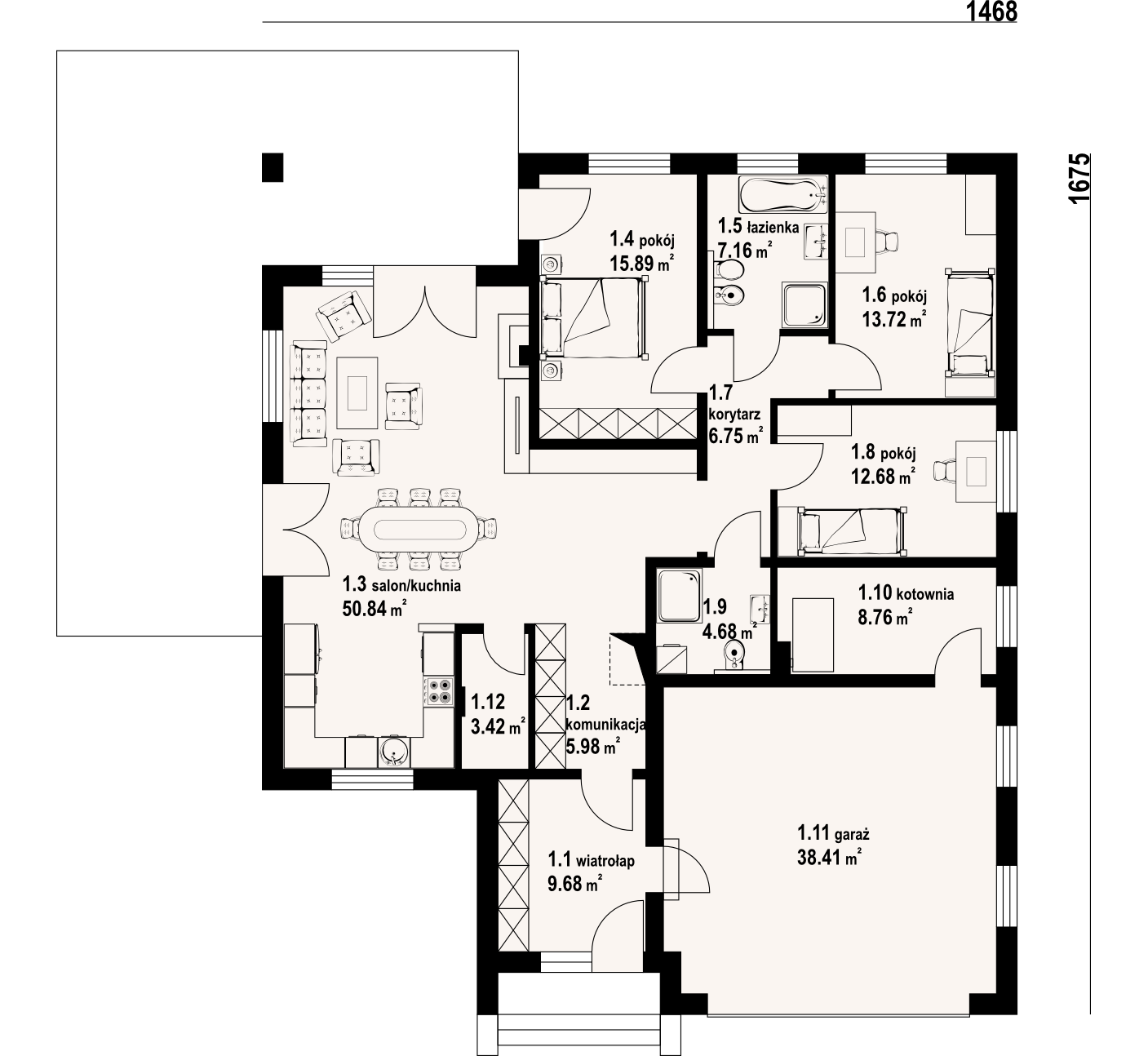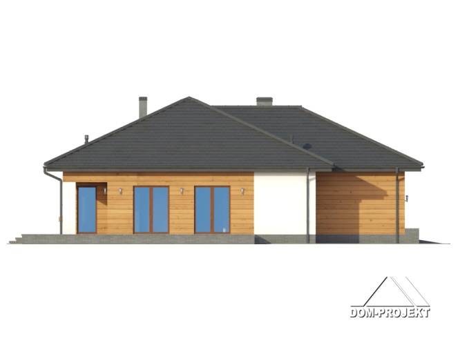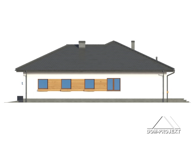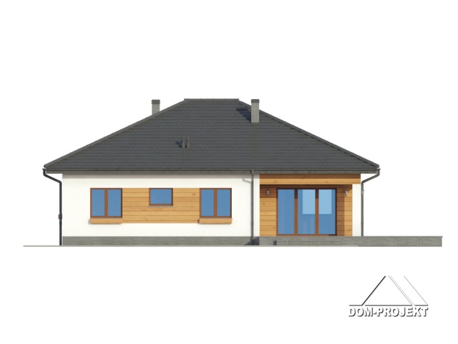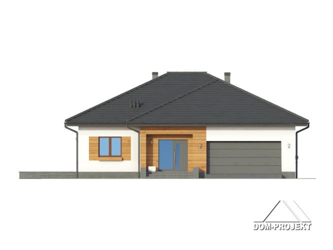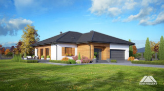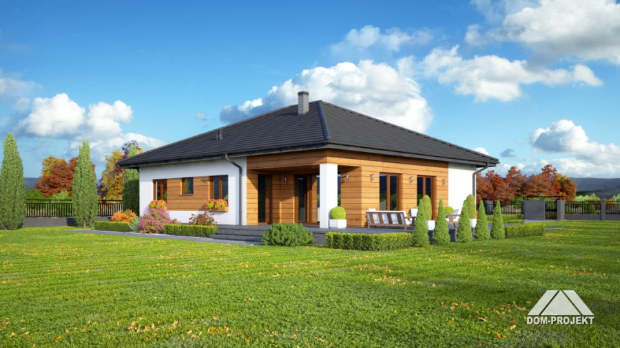 Dom parterowy z garażem na dwa samochody. Duży salon z aneksem kuchennym, kominkiem i wyjściem na taras. Spiżarka, komunikacja, wiatrołap, trzy pokoje, dwie łazienki, korytarz, garaż i kotłownia.