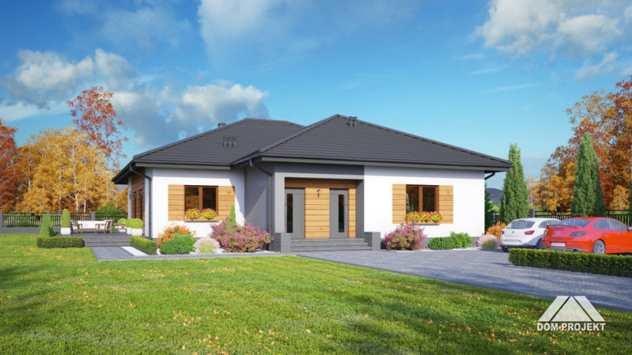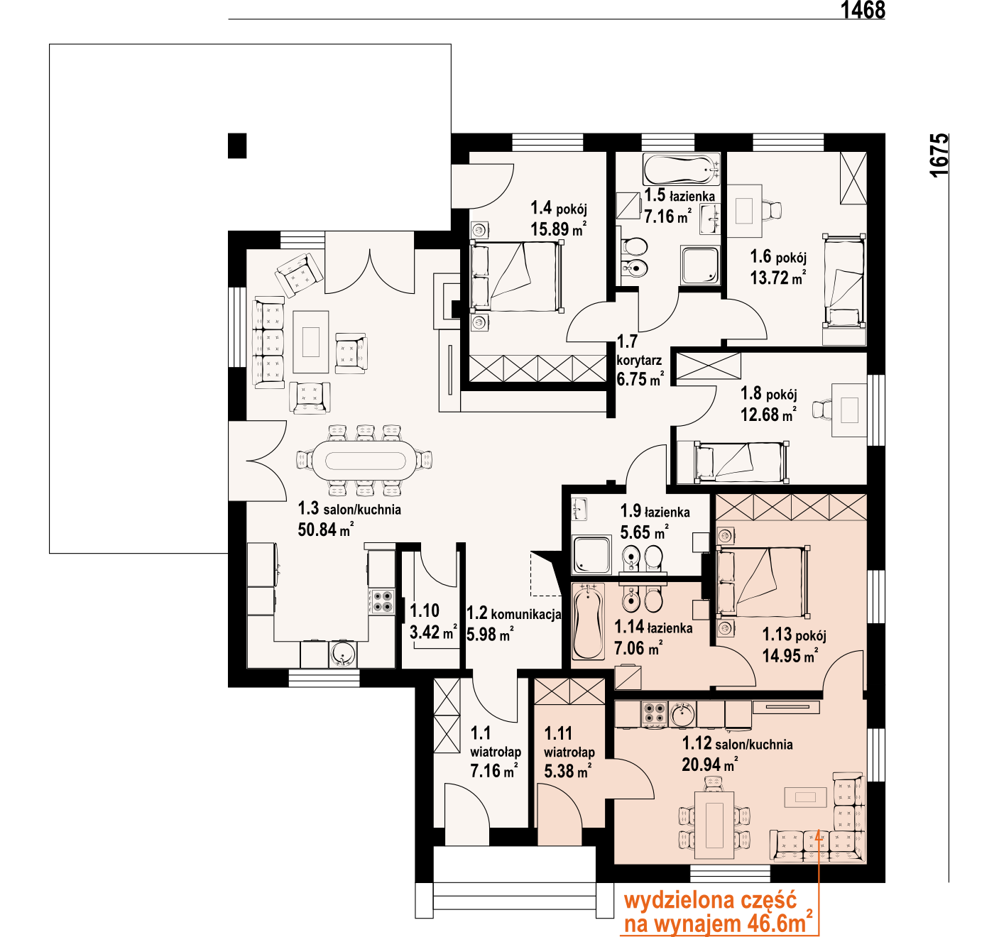 Wygodny dom jednorodzinny z odrębnym mieszkaniem na wynajem. Duży salon z aneksem kuchennym, kominkiem i wyjściem na taras. Trzy pokoje, dwie łazienki, korytarz, komunikacja i wiatrołap. W części do wynajmu salon z aneksem kuchennym, pokój, łazienka, wiatrołap.