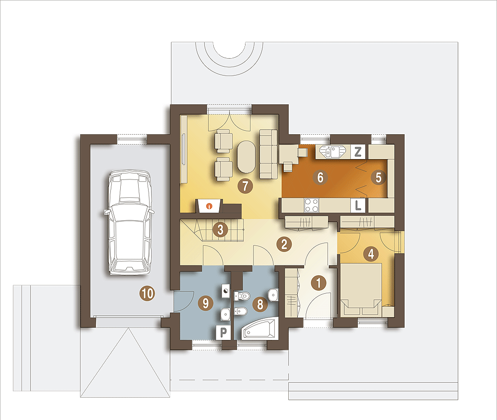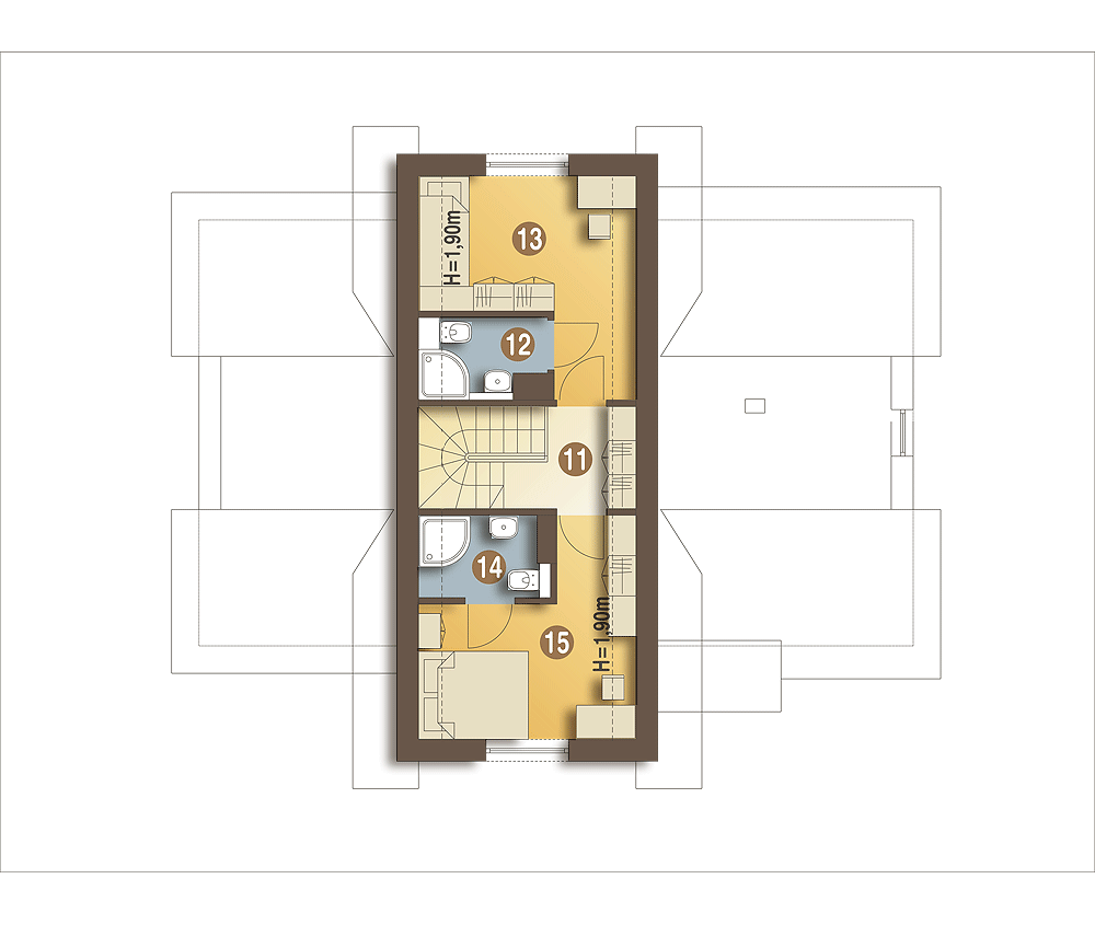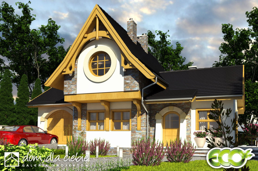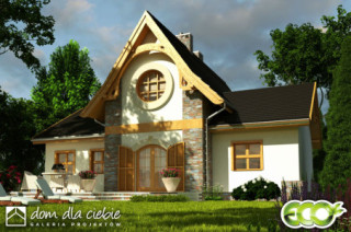 Tradycyjny, ciekawy dom rodzinny dla 3 do 4-ro osobowej rodziny. Parter jako część ogólna obejmuje: pokój, salon z kominkiem oraz miejscem do spożywania posiłków i otwartą wygodną kuchnią, przy której znajduje się spiżarnia; wygodny hol i schody na górę oraz łazienkę i pomieszczenie techniczne z piecem CO na paliwo stałe lub na gaz. Pomieszczenie CO spełnia równocześnie funkcję łącznika komunikacyjnego między garażem a częścią mieszkalną. Na piętrze znajdują się dwie sypialnie z łazienkami oraz hol. Budynek posiada atrakcyjny wygląd.fundamenty: BETONOWE ściany zewnętrzne: POTOTHERM+OCIEPLENIE ściany wewnętrzne: POTOTHERM,CEGŁ.DZIURAWKA,G-K rodzaj stropu: TERIVA elewacje: TYNK STRUKTURALNY, OKŁADZINA KAMIENNA pokrycie dachu: DACHÓWKA CER.