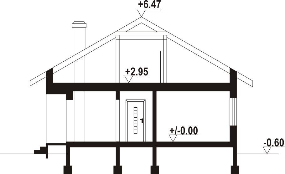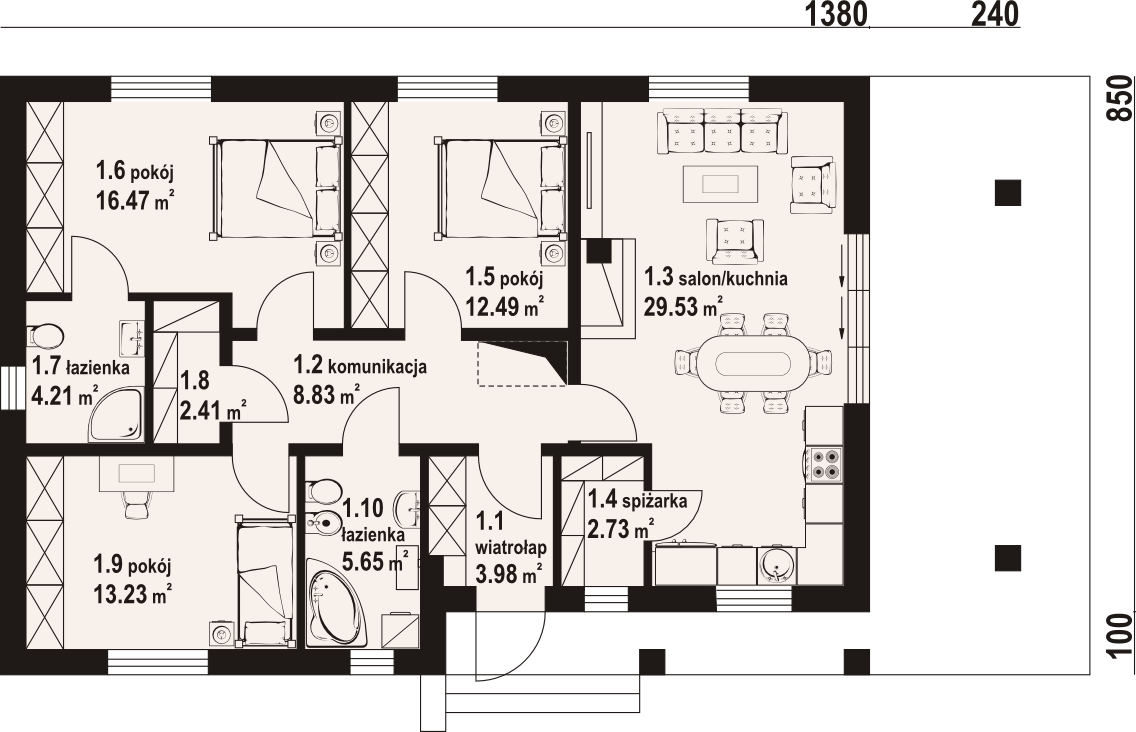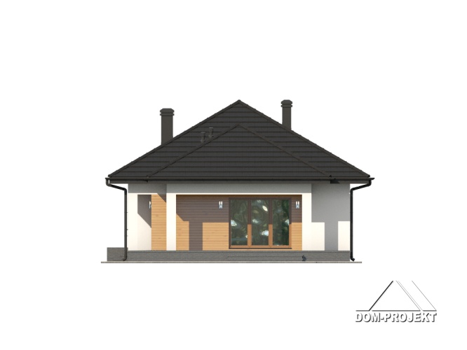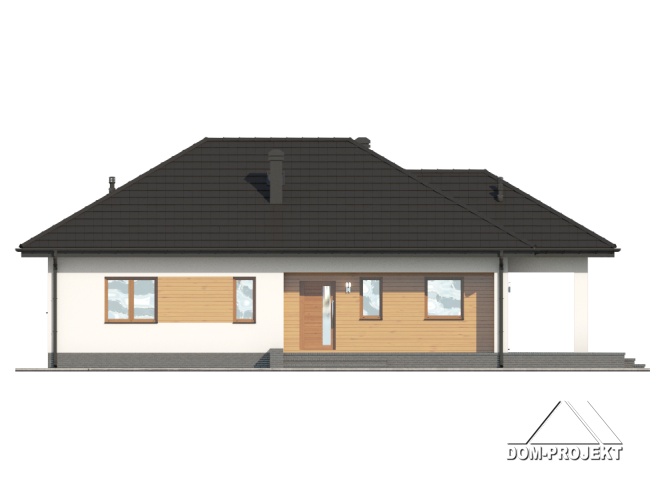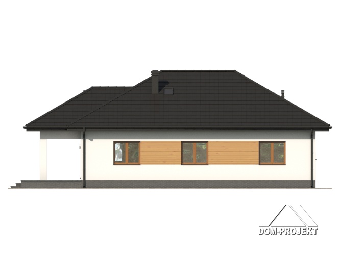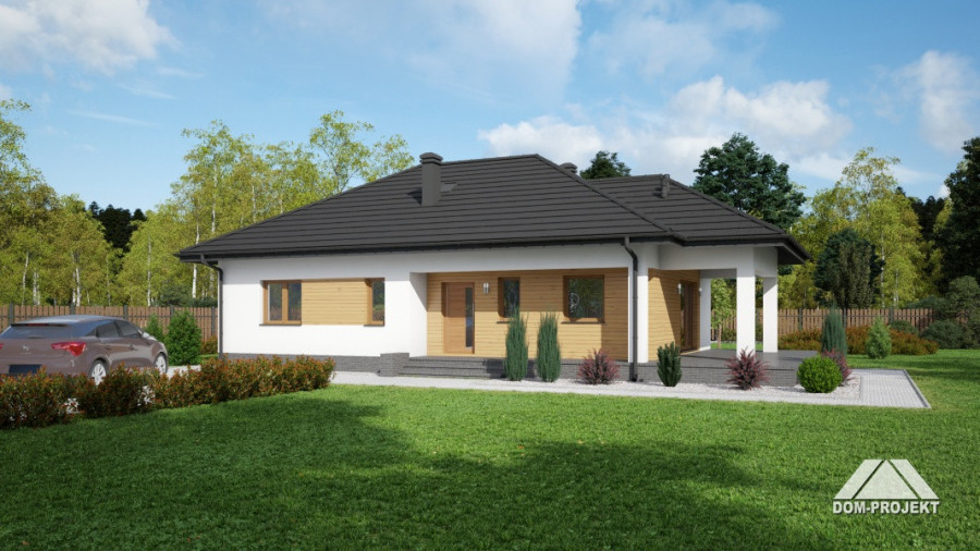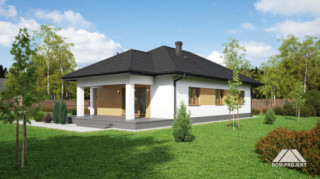 Dom parterowy. Duży salon z aneksem kuchennym, kominkiem i wyjściem na zadaszony taras. Trzy pokoje, łazienka, wc, komunikacja, garderoba i wiatrołap. Wyjście na poddasze schodami strychowymi rozkładanymi.