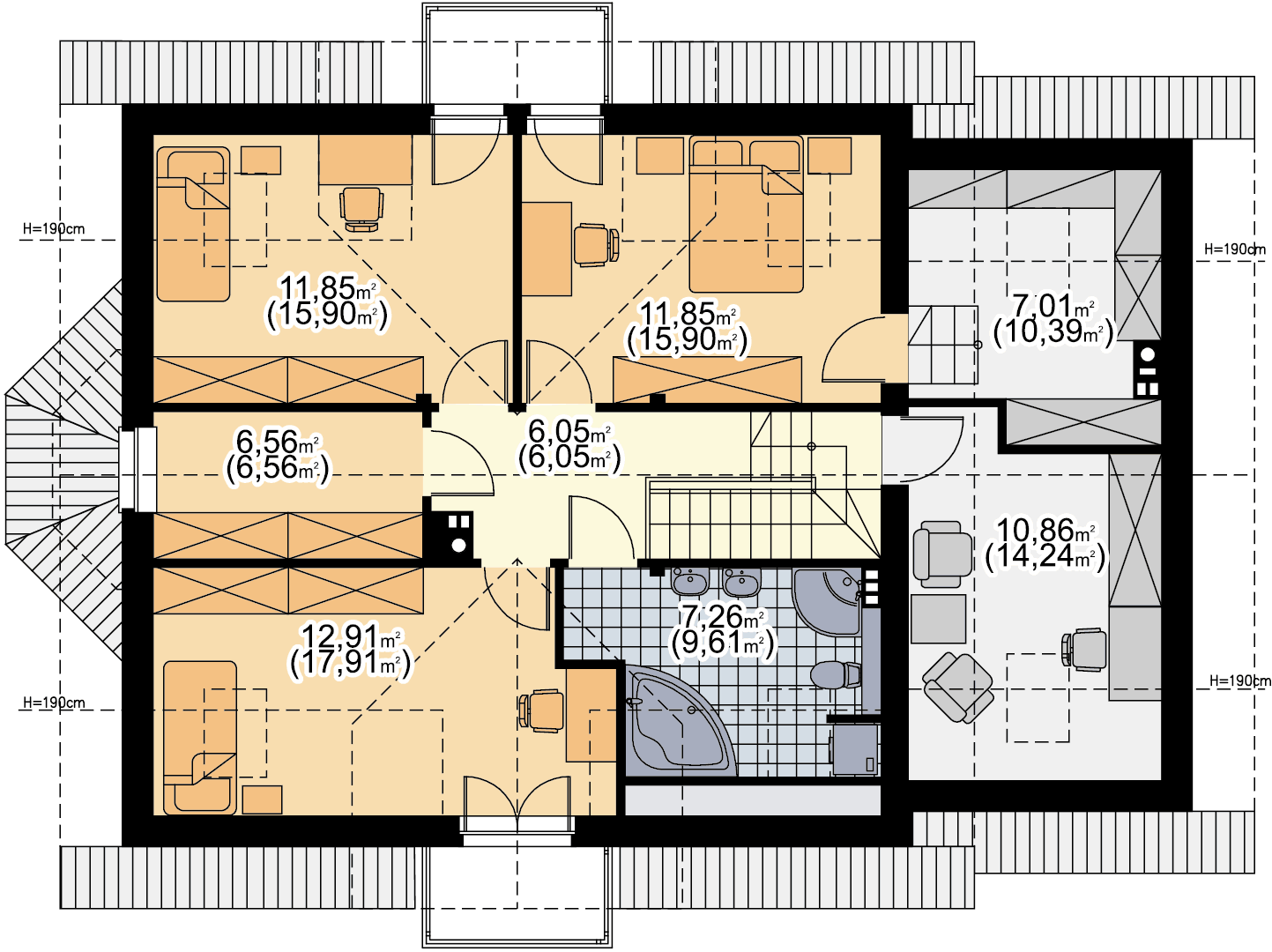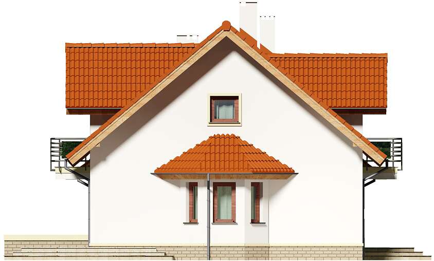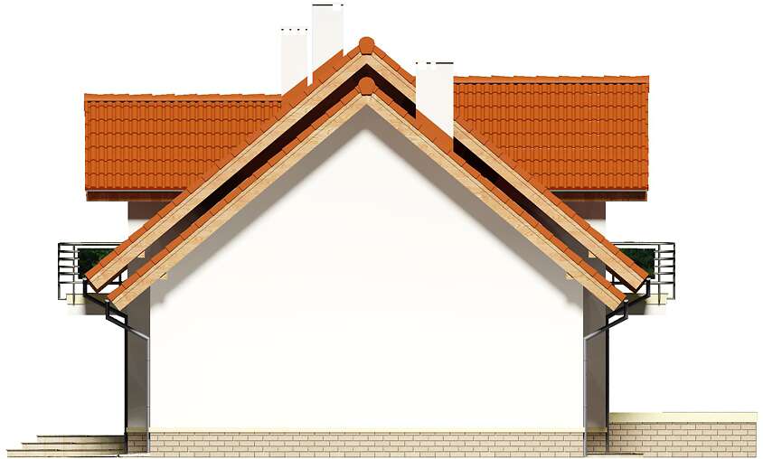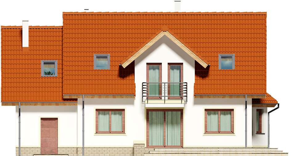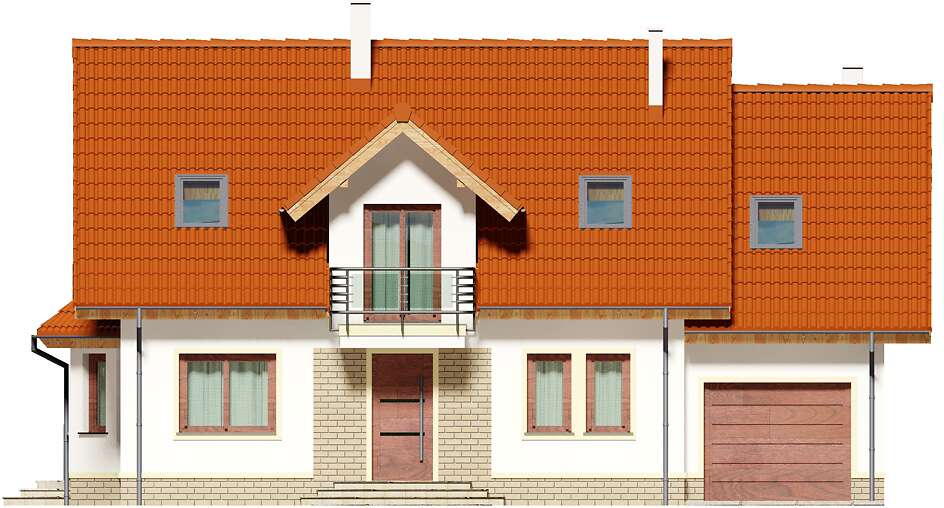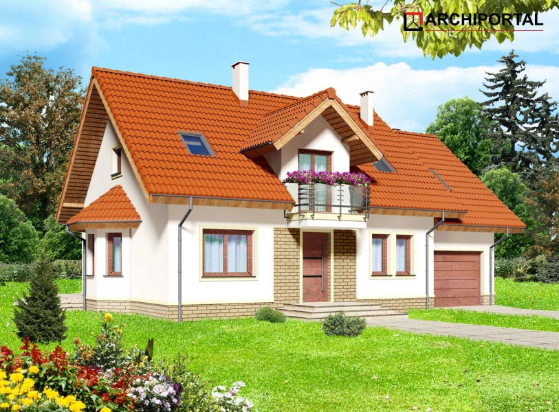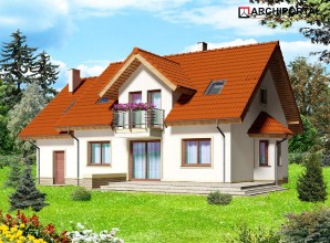 Projekt klasycznego domu z dwuspadowym dachem, w którym wygonie zamieszka 4-5 osobowa rodzina. Do dyspozycji mieszkańców jest duża otwarta kuchnia (w razie potrzeby można ją zamknąć ścianką działową). Nie zapomniano w niej o miejscu pod zabudowę sprzętem AGD i praktycznej spiżarni. Duży, przestronny salon z ciekawym wykuszem jadalnym jest doskonałym miejscem wypoczynku w ciągu dnia, a centralne położenie kominka nadaje całości przytulnego charakteru i doskonale sprawdzi się podczas ogrzewania domu w zimie. Bezpośrednio z pokojem dziennym sąsiaduje dodatkowy pokój, który może pełnić funkcję gabinetu lub pokoju gościnnego. Do garażu dostajemy się przez praktyczne pomieszczenie gospodarcze, w pobliżu którego znalazła się niewielka łazienka. Za garażem znajduje się kotłownia, z bezpośrednim wyjściem na ogród. Jej duża powierzchnia pozwala rozważać inny sposób ogrzewania niż gazowe. Poddasze to typowa strefa nocna. Znajdują się tu 3 ustawne pokoje, duża łazienka oraz dodatkowa garderoba. W razie potrzeby garderobę można połączyć z jednym z przylegających do niej pokojów lub zaadaptować ją na pralnię. Prawdziwą zaletą jest jednak pomieszczenie znajdujące się nad garażem. Zostało ono podzielone na dwie części. Do jednej dostajemy się wprost z pokoju rodziców i może ona stanowić, dodatkową garderobę. Drugą część, dostępną z klatki schodowej, można przerobić na gabinet, pokój hobby, lub po prostu dodatkowe pomieszczenie mieszkalne. Pomieszczenia te mogą być też połączone, tworząc jedno duże. Dom ma nieskomplikowaną bryłę i prosty dach, dzięki czemu będzie tani w budowie i późniejszej eksploatacji.