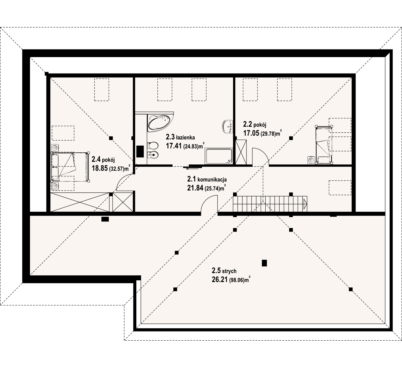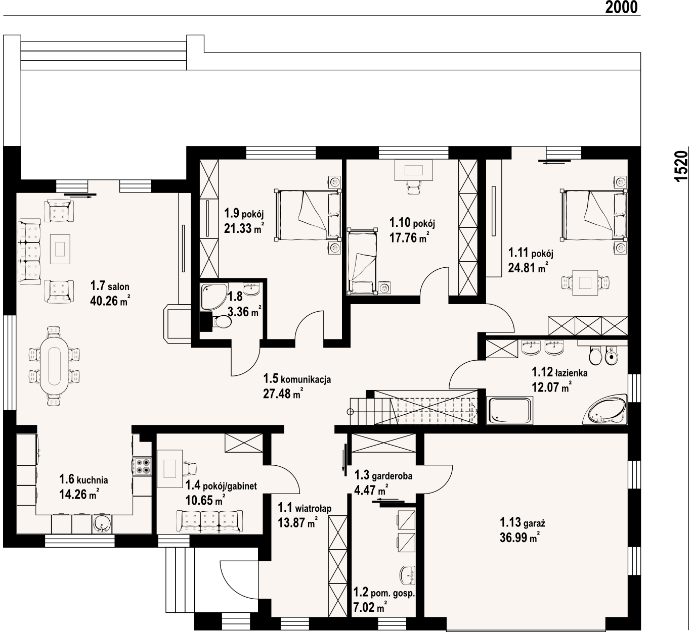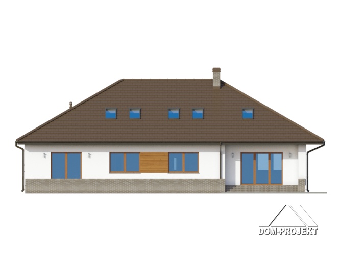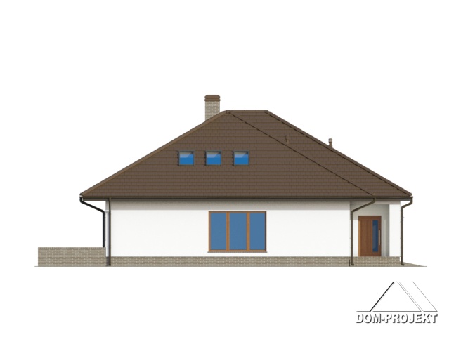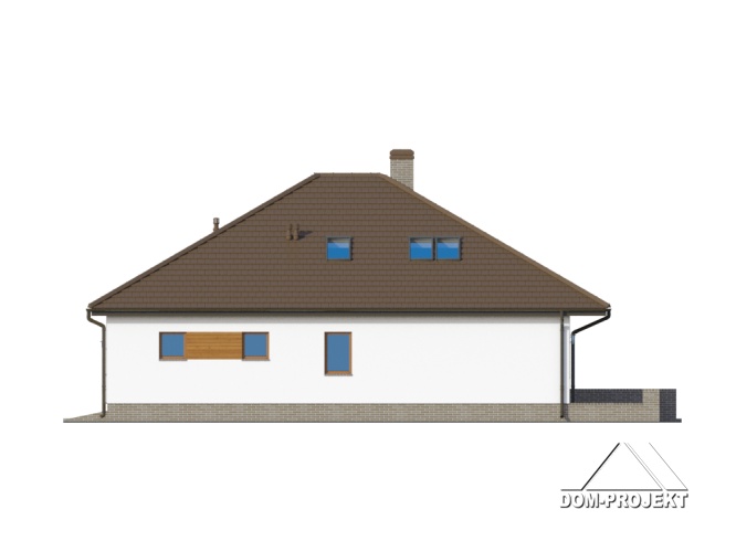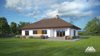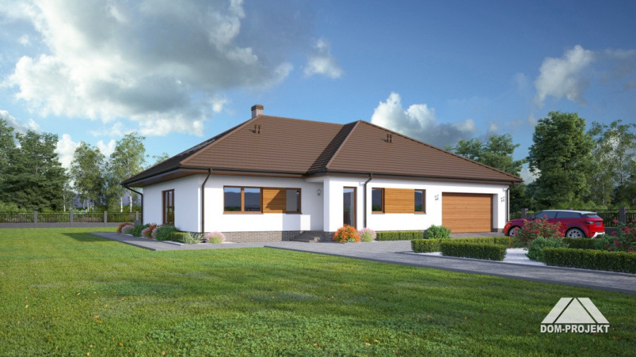 Dom parterowy z poddaszem użytkowym. Na parterze duży salon z aneksem kuchennym, kominkiem i wyjściem na taras, cztery pokoje, łazienka, wc, pomieszczenie gospodarcze, garderoba, wiatrołap, garaż na dwa samochody, komunikacja i schody na poddasze. Na poddaszu dwa pokoje, łazienka, komunikacja i strych.
