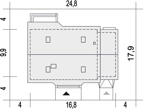 Budynek mieszkalny dwulokalowy, parterowy, niepodpiwniczony. Program użytkowy dla jednej części budynku na parterze: pokój dzienny połączony z kuchnią, dwie sypialnie, łazienka, wiatrołap oraz wspólna kotłownia. W pokoju dziennym znajduje się kominek będący dodatkowym żródłem ciepła na chłodniejsze dni. Budynek posiada częściowo zadaszony taras z efektowną pergolą. Ściany: 2-warstwowe - pustak ceramiczny + styropian, Stropy: belki drewniane + wełna mineralna, Dach: dachówka ceramiczna, kąt nachylenia 30°