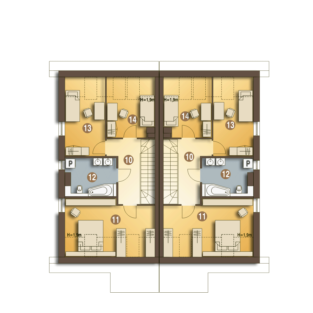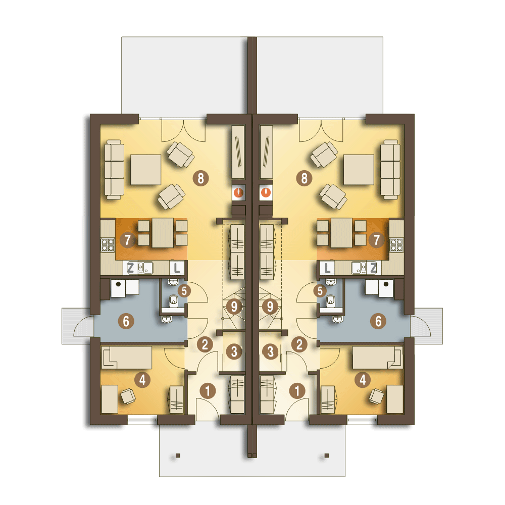 (Uwaga: projekty typu bliźniak oferujemy jako domy dwulokalowe, projekt można zamówić również w zabudowie bliźniaczej) Projekt Azalia B-BL1, to propozycja dla deweloperów i osób zainteresowanych domami dwulokalowymi. Budynek prosty w formie oraz proste rozwiązania konstrukcyjne gwarantują niski koszt jego budowy. Dzięki ciepłym barwom kolorystyce, projekt Azalia prezentuje się wyjątkowo atrakcyjnie, wyróżniając się kontrastowym zestawieniem kolorów. Funkcja budynku to dwie strefy: ogólnodostępna i prywatna. Na parterze mamy przewidziany wiatrołap, hol ze spiżarnią, pokój/gabinet, pomieszczenie gospodarcze - kotłownię, osobną toaletę, kuchnię z małą jadalnią i salon z kominkiem. Na poddasze prowadzą jednobiegowe schody. Tutaj przewidujemy wygodny przedpokój, wspólną obszerną łazienkę, 3 sypialnie w tym jedna z garderobą.fundamenty: BETONOWE ściany zewnętrzne: POROTHERM+STYROPIAN TERMO ORGANIKA rodzaj stropu: TERIVA I elewacje: TYNK STRUKTURALNY pokrycie dachu: DACHÓWKA CEM. lub CER.