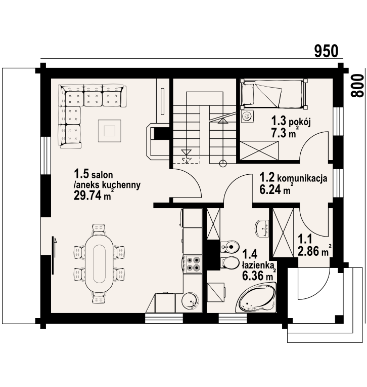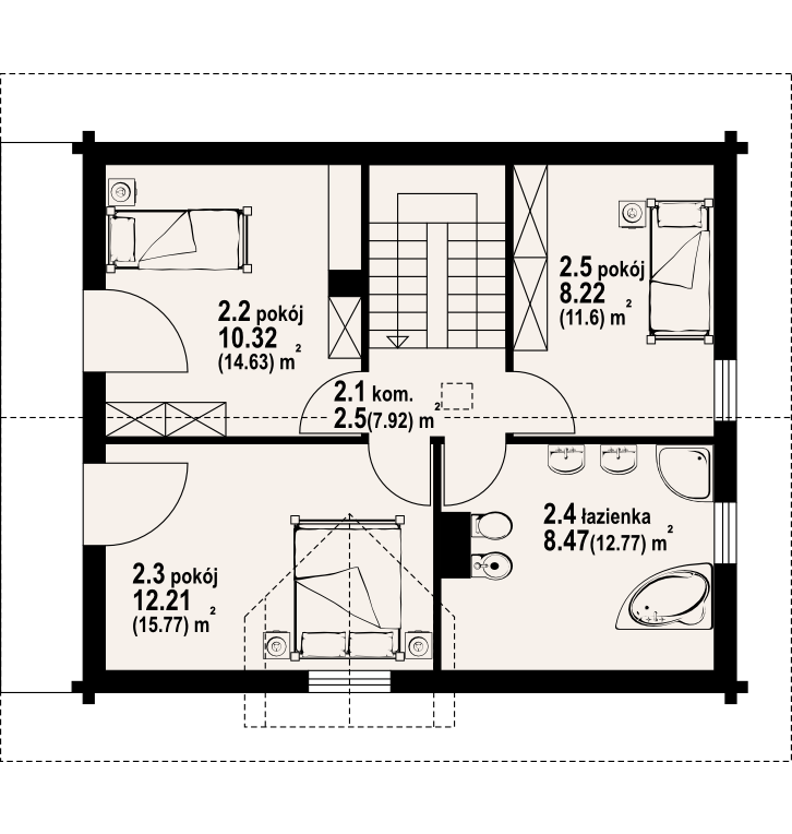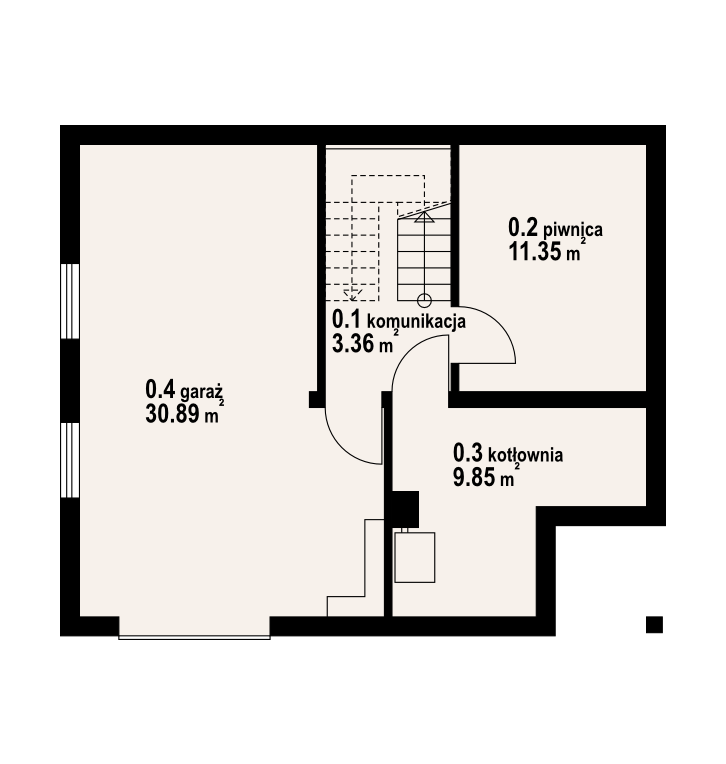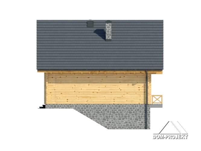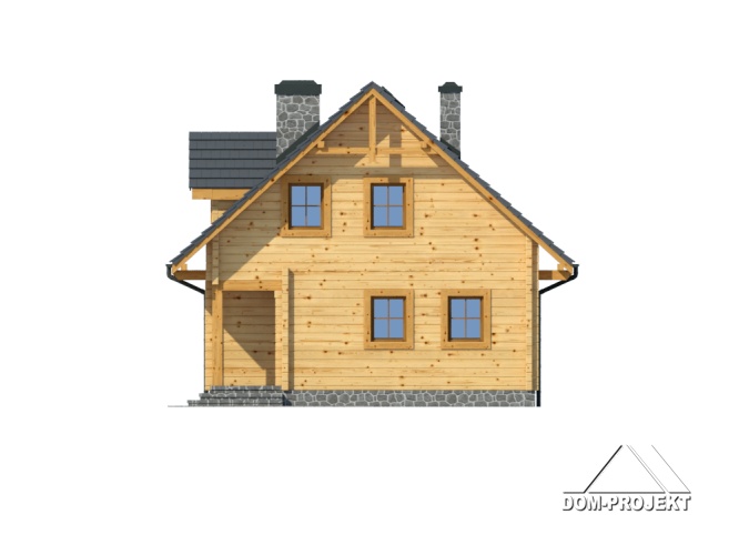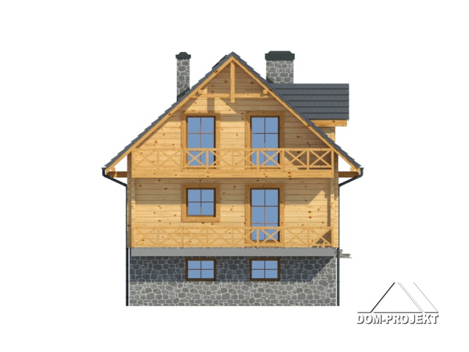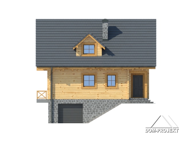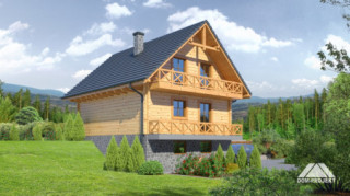 Podpiwniczony dom z bali drewnianych. Duży salon z aneksem kuchennym, jadalnią , kominkiem i wyjściem na taras. Pokój, łazienka, wiatrołap, komunikacja i schody. Na poddaszu trzy pokoje, łazienka, komunikacja i balkon. W piwnicy garaż, kotłownia, piwnica. Zwarta bryła budynku sprzyja szybkiej budowie i niskim kosztom eksploatacji.