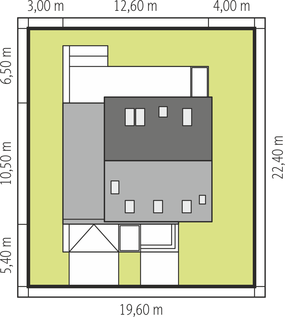 Prosty w budowie dom z poddaszem użytkowym. Na parterze połączony z kuchnią (aneks) salon, dodatkowy pokój oraz łazienka. W salonie kominek a w narożu schody prowadzące na poddasze. Tam znajdują się trzy sypialni i wygodna łazienka.