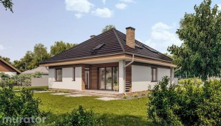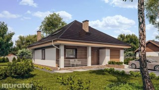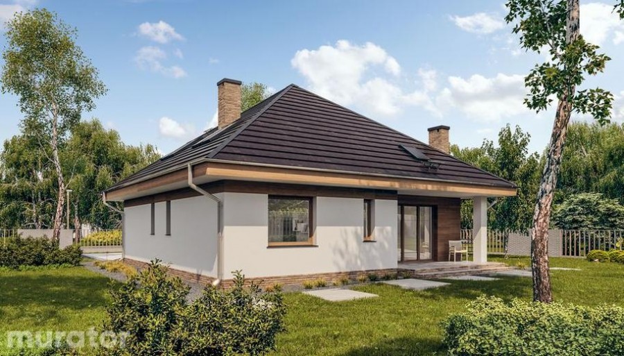 Nieocenionym atutem domu Barwnego jest niewątpliwie jego prosta konstrukcja, która usprawni budowę i obniży jej koszty. Dom zaprojektowany został na planie kwadratu. Posiada również wielospadowy dach. Materiały zdobiące elewację – ciemne drewno i cegła klinkierowa, przywodzą miłe skojarzenia. Dzięki temu domek idealnie będzie się prezentował zarówno w wiejskich krajobrazach, jak i na przedmieściach większych miast. Przy głównym wejściu umieszczono zabudowany ganek, który będzie przestrzenią wypoczynkową w cieplejszych sezonach. Wewnątrz, przestrzeń wypoczynkową tworzył będzie niewątpliwie salon. Umieszczono w nim kanapę i fotele, ustawione wokół narożnego kominka, który ogrzeje tę dosyć sporą przestrzeń. Kuchnię umieszczono tuż przy wejściu. Dzięki ustawieniu mebli w kształt litery „U”,