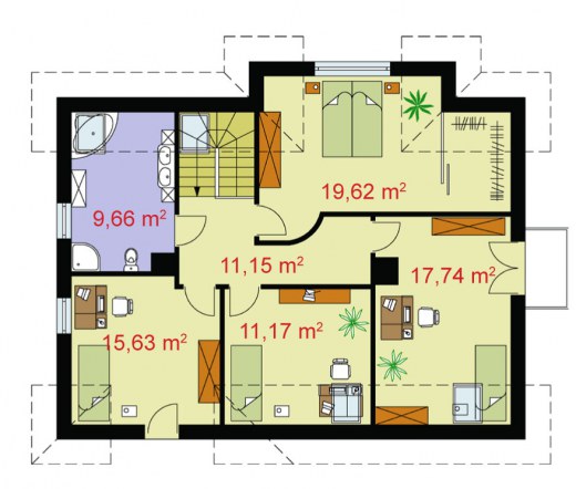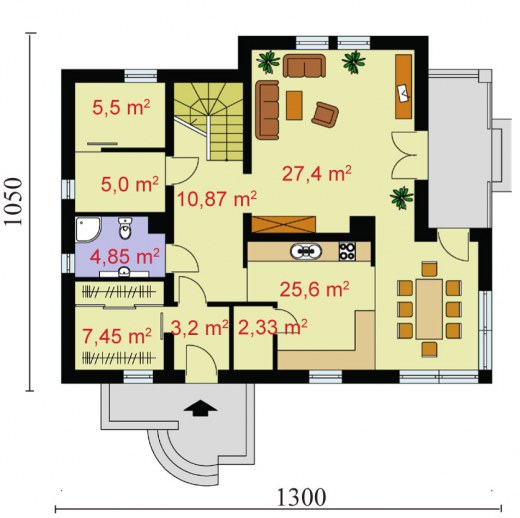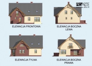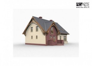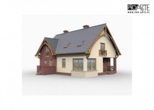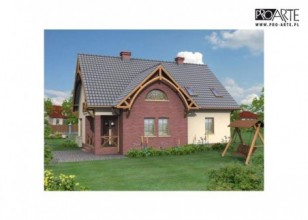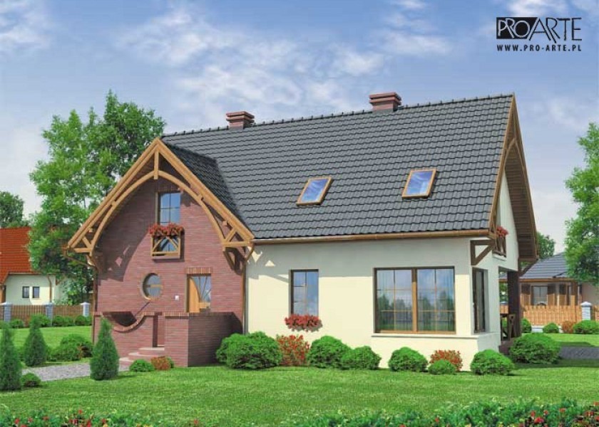 To przestronny, niepodpiwniczony dom, z możliwością adaptacji kotłowni na węgiel. Z zewnątrz dom, ze względu na elementy wykończeniowe, tworzy przyciągającą uwagę kontrastami kolorystycznymi, całość. Wejście umieszczone zostało w ryzalicie charakteryzującym się ciekawymi rozwiązaniami architektonicznymi, wykończonym czerwoną cegłą. Kilka schodków, znajdujących się na zewnątrz domu, z obu stron oddzielają ciekawe murki. Ten po prawej – jest foremny, natomiast murek po lewej przylega niejako do elewacji frontowej domu, jest zakończony od góry falistym wgłębieniem i otwiera schody dla domowników oraz gości. Obok drzwi umieszczono efektowne, okrągłe okno. Wnętrze domu zachwyci nas mnóstwem pomieszczeń. Wchodząc