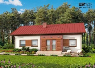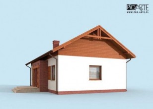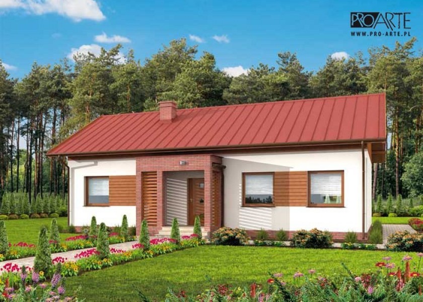 Projekt domu jednorodzinnego - Bellona to propozycja domu jednorodzinnego dla Inwestorów, którzy planują wybudować budynek do 100 m2. Oryginalnie zaprojektowany ganek oraz weranda przyciągają wzrok. Ich dopełnieniem są równoległe odeskowania łączące werandę z oknem kuchennym. Ładnie prezentuje się też przestrzeń między oknami, odeskowania gustownie podkreślają piękno elewacji. Dwuspadowy dach o kącie nachylenia 30 stopni zapewnia bezpieczne odprowadzanie opadów atmosferycznych. Taras to miejsce, które będzie oblegane podczas słonecznych dni i cieplejszych wieczorów. Warto takie miejsce w swoim domu zagospodarować, sprzyja ono integracji i jest wymarzonym miejscem spotkań. Za werandą znajduje się wiatrołap z wnękową garderobą, dalej zlokalizowany jest przedpokój płynnie łąc