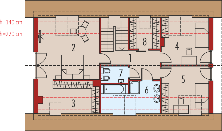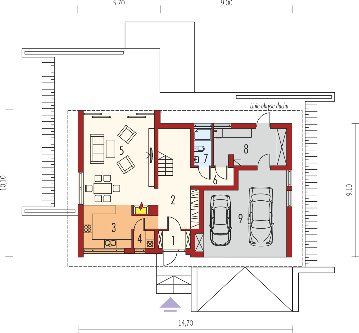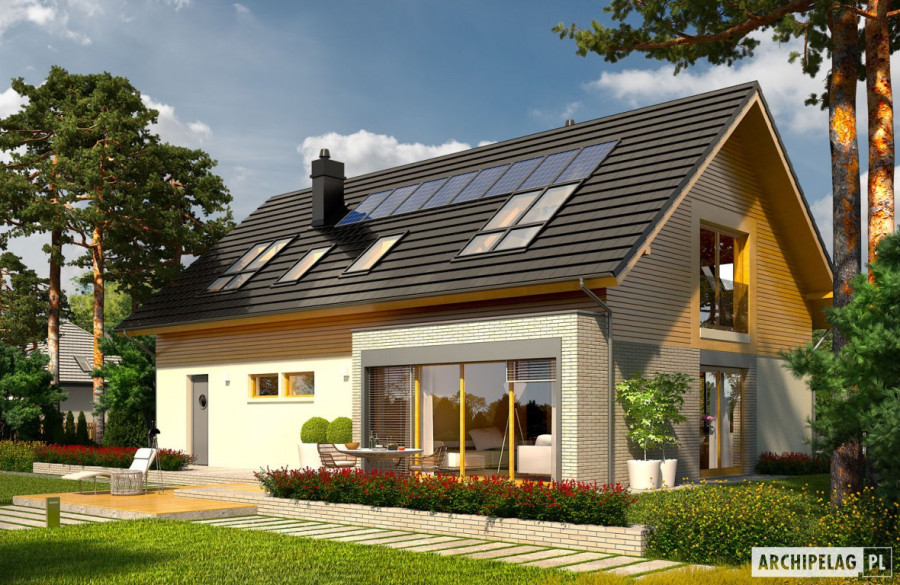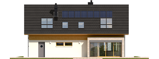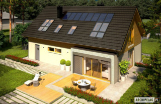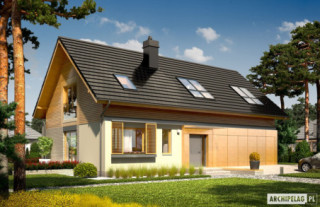 Charakterystyka: Dom parterowy z poddaszem użytkowym, niepodpiwniczony, z garażem dwustanowiskowymPrzeznaczenie: Dom dla 4-5-osobowej rodzinyTechnologia i konstrukcja: Ściany zewnętrzne: murowane, dwuwarstwowe, izolacja wełna mineralna grubości 20 cm Strop: gęstożebrowy Dach: konstrukcja drewniana, izolacja wełna mineralna 30 cm, dachówka płaska lub inna o podobnych parametrach Rozwiązania instalacyjne: Ogrzewanie: kocioł gazowy, rozprowadzenie ciepła: grzejniki Wentylacja: grawitacyjna Wykończenie:Elewacje: tynk cienkowarstwowy mineralny w kolorze TO-OR001 z palety firmy Termo Organika i okładzina drewnianaStolarka okienna: drewniana, PCV lub aluminiowaWersje w serii Benjamin - zapytaj o dostępność: – Benjamin G1 ENERGO – wersja podstawowa, standardowe instalacje – Benjamin G1 ENERGO PLUS – taki sam układ funkcji jak w wersji podstawowej, instalacje energooszczędne: pompa ciepła, wentylacja mechaniczna i panele fotowoltaiczne– Benjamin II G2 ENERGO – taki sam układ funkcji jak w wersji podstawowej, garaż 2-stanowiskowy, inne wykończenie elewacji, standardowe instalacje– odbicie lustrzane do każdej wersjiWszystkie wersje domów możliwe w dwóch standardach/wariantach instalacyjnych: – ENERGO: kocioł gazowy kondensacyjny, grzejniki, wentylacja grawitacyjna, OZE: kolektory słoneczne – ENERGO PLUS: pompa ciepła, ogrzewanie podłogowe, wentylacja mechaniczna, OZE: panele fotowoltaiczne Istnieją techniczne możliwości wykonania zmian: – podpiwniczenia budynku – wykonania budynku w technologii szkieletowej – dokonania zmian funkcjonalnych wg indywidualnych wymagańAtuty projektu okiem architekta:- Bryła sprzyjająca energooszczędności, zminimalizowane ryzyko występowania mostków termicznych- Okna o niskim współczynniku przenikania ciepła- Efektowna kompozycja elewacji- Zastosowanie oryginalnych rozwiązań materiałowych- Ciekawie zaprojektowane detale- Dobre parametry cieplne- Funkcjonalne i ergonomiczne wnętrze- Wygodny salon z kominkiem- Komfortowa sypialnia z garderobą na poddaszu- Duży salon łazienkowy na poddaszu- Duże pomieszczenie kotłowni, które pozwala na zastosowanie dowolnego źródła ogrzewania