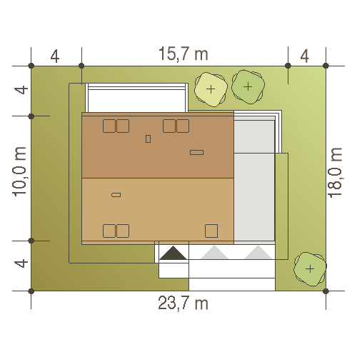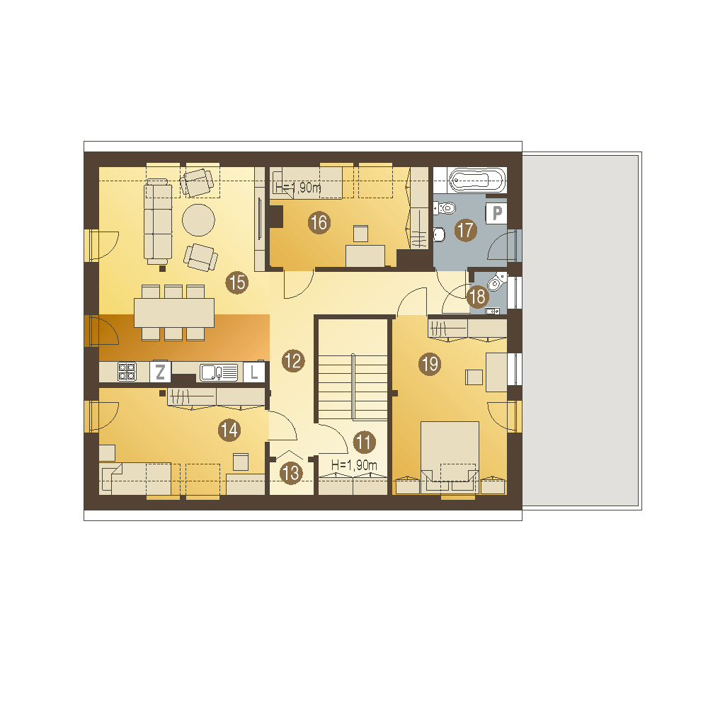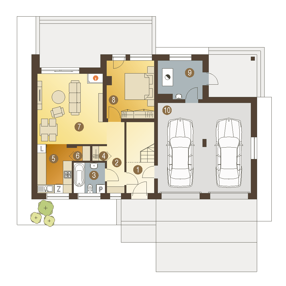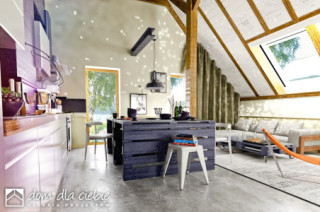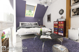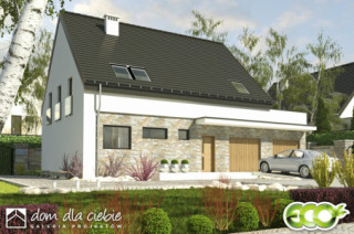 Bernikla jest projektem domu wykonanym z dedykacją dla rodzin pokoleniowych. Projekt ten nowoczesny w formie, zawiera dwa niezależne lokale mieszkalne. Mieszkanie na parterze przeznaczone zostało dla starszego pokolenia i składa się z wygodnego salonu z kominkiem, kuchni ze spiżarnią, sporej łazienki oraz wygodnej sypialni. W holu przewidziano niewielką garderobę.Z salonu i sypialni można wyjść na duży taras. Parter budynku zawiera w sobie również część techniczną i dwa garaże. Na piętrze znajduje się większe drugie mieszkanie, przeznaczone dla rodziny z dziećmi. Mieszkanie to posiada trzy sypialnie, salon z kuchnią, łazienkę, wc, garderobę. Do mieszkania przynależy taras nad garażem dostępny z dwuosobowej sypialni i łazienki. Ciekawym pomieszczeniem tego mieszkania jest salon z kuchnią, ponieważ w projekcie pozostawiona została otwarta przestrzeń skośnego poddasza. Takie rozwiązanie daje bardzo duże możliwości aranżacyjne i dekoracyjne. Forma domu jest bardzo prosta, z przemyślana funkcją co pozwala na obniżenia kosztów budowy i późniejszej eksploatacji.fundamenty: BETONOWE ściany zewnętrzne: POROTHERM 25cm+STYROPIAN 15cm TERMO ORGANIKA rodzaj stropu: TERIVA I elewacje: TYNK STRUKTURALNY pokrycie dachu: DACHÓWKA CEM. lub CER.