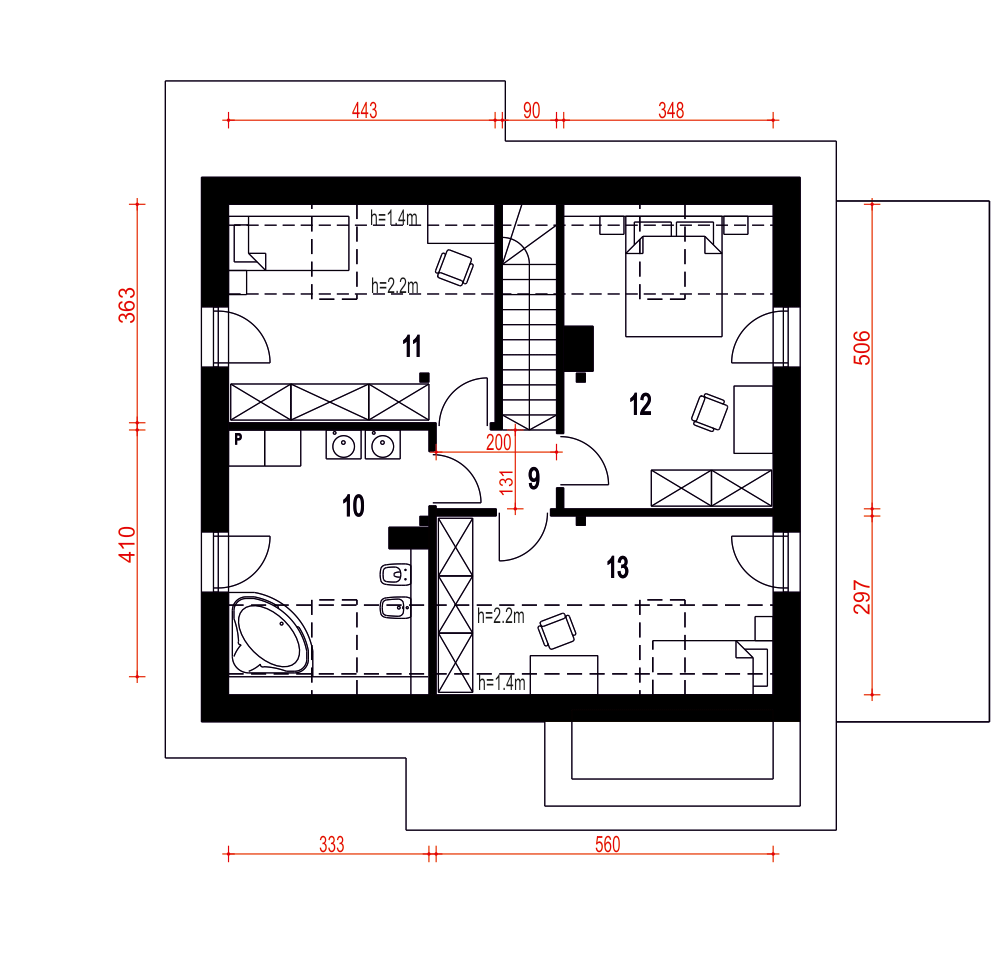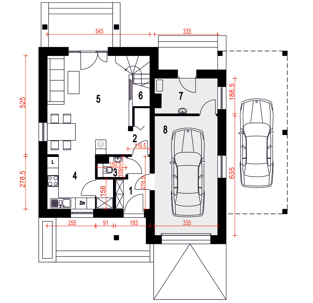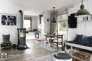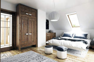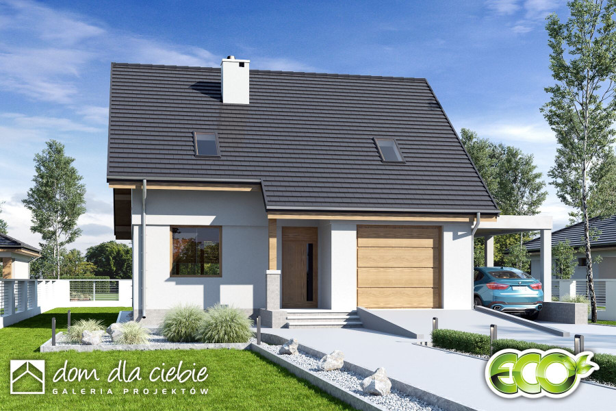 Projekt gotowy Biała to nieduży dom jednorodzinny z poddaszem użytkowym. Nieduża powierzchnia ( ok. 95 m2 - bez garażu) została wykorzystana efektywnie zyskując ustawną przestrzeń. Parter zawiera strefę wspólną, dzienną, gdzie mieści się prostokątny, ustawny salon z jadalnią i wyjściem na zadaszony taras oraz otwartą kuchnię a także schody na druga kondygnację. W centralnym punkcie salonu zaprojektowano komin, do którego można podłączyć kominek równomiernie rozprowadzający ciepło po domu. Miejsce na niewielką garderobę dostępną z holu zostało przewidziane pod schodami. Kuchnia wyposażona została w wygodną spiżarnię, a z wiatrołapu można dostać się do WC i garażu oraz dalej do kotłowni przewidzianej na paliwo gazowe. Na piętrze zaprojektowano trzy sypialnie, oraz duża łazienkę. Biała, to zgrabny domek z zadaszonym wejściem, praktycznym podcieniem za kotłownią oraz zadaszonym wyjściem na taras. W pokojach na piętrze przewidziano portfenetry i dodatkowo okna połaciowe co spowoduje ich doskonałe doświetlenie. Projekt ten szczególnie polecamy na wszystkie tereny zarówno podmiejskie, miejskie i wiejskie ze względu na jej uniwersalną architekturę. Oszczędna forma i optymalnie wykorzystana powierzchnia użytkowa sprawia że domek ten bedzie tani i ekonomiczny w eksploatacji oraz budowie.