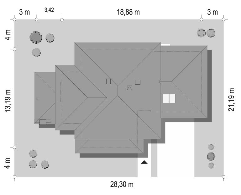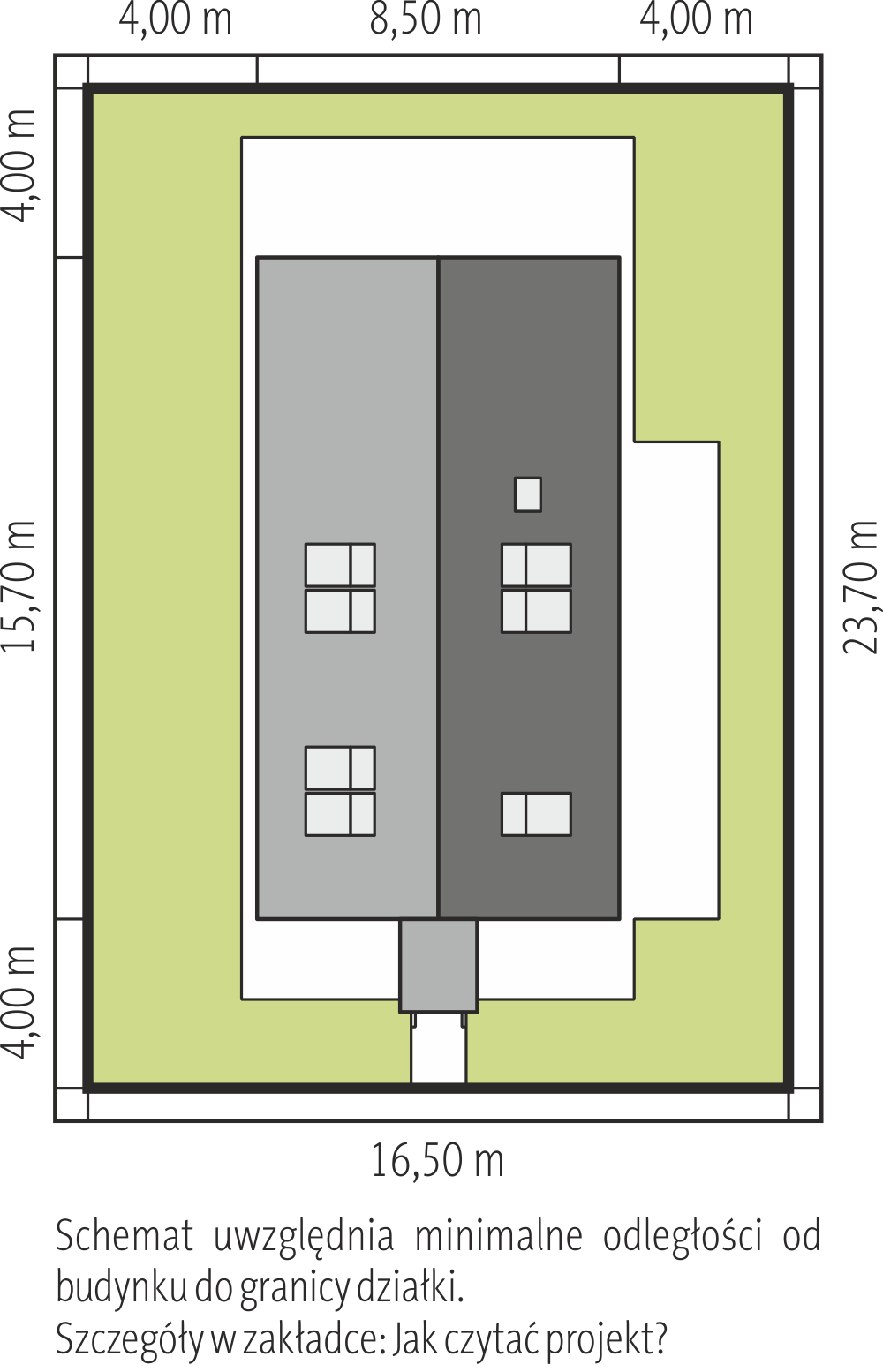 Budynek dla 4-5 osobowej rodziny. W piwnicach znajduje się kotłownia, garaż, schowek i pomieszczenie gospodarcze. Na parterze zlokalizowano hol, jadalnię, kuchnię, garderobę, pokój dzienny i w.c. Na poddaszu znajdują się 3 pokoje sypialne, garderoba, łazienka i przedpokój. Bryłę budynku stanowi prostopadłościan, przykryty dachem dwuspadowym o kącie nachylenia połaci 45°. Prostokątny obrys budynku o niewielkich gabarytach umożliwia realizację na wąskiej działce