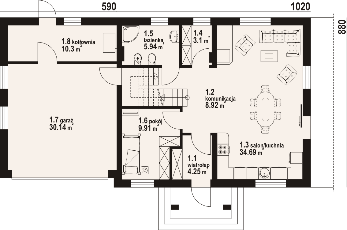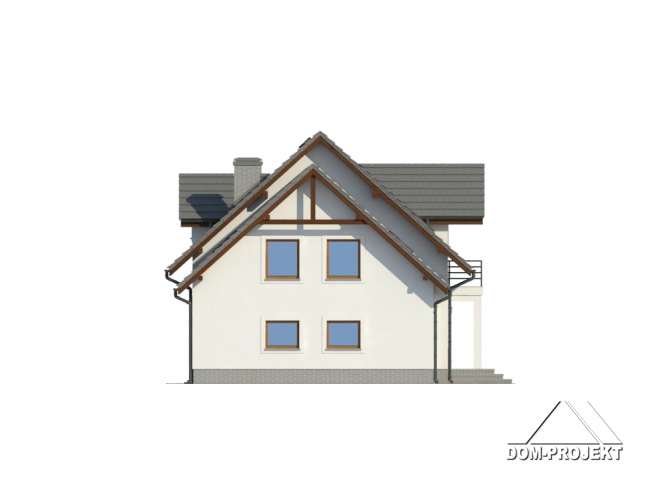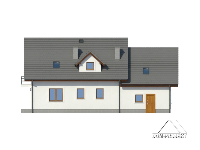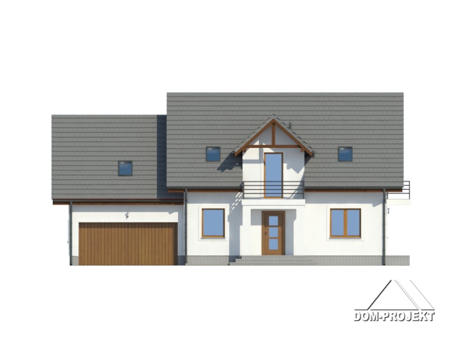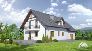 Dom jednorodzinny z garażem na dwa samochody. Duży salon z aneksem kuchennym, kominkiem i wyjściem na taras. Pokój, łazienka, spiżarka, wiatrołap, garaż i kotłownia. Na poddaszu trzy pokoje (każdy ma balkon), łazienka, komunikacja i strych (może być adaptowany na cele mieszkalne). Zwarta bryła budynku sprzyja szybkiej i taniej budowie oraz niskim kosztom eksploatacji.