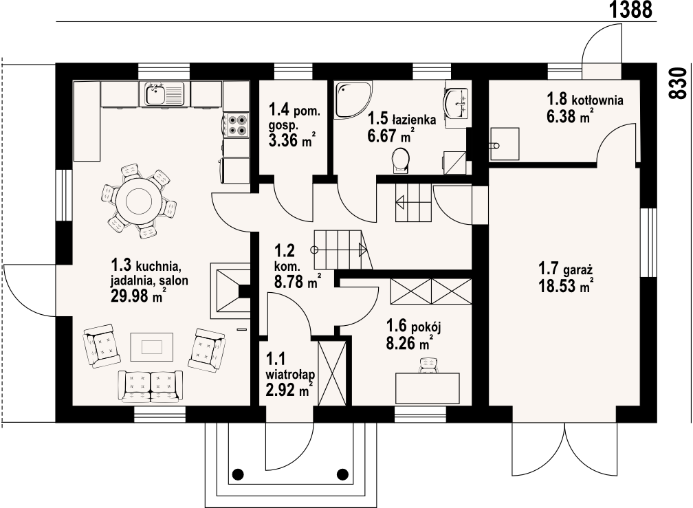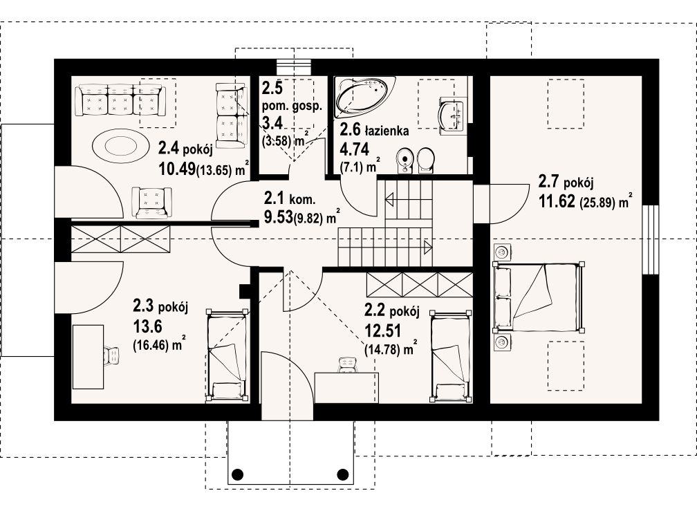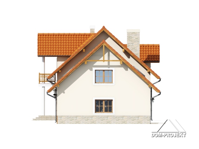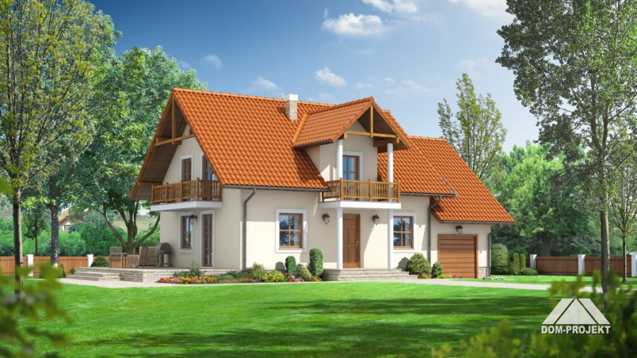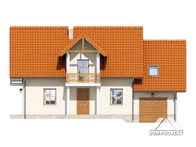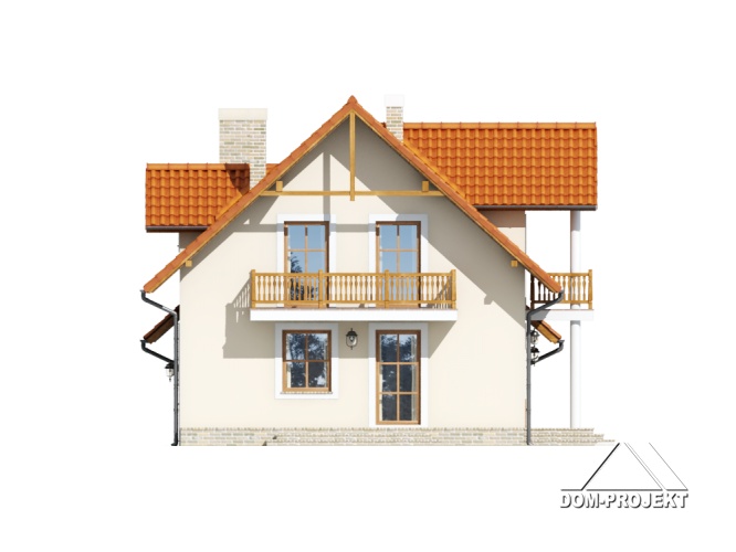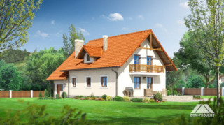 Dom z poddaszem użytkowym i dodatkową częścią gospodarczą. Prosta, symetryczna architektura. Przemyślane proporcje pomieszczeń. Zwarta bryła budynku zapewnia niskie koszty budowy i eksploatacji.