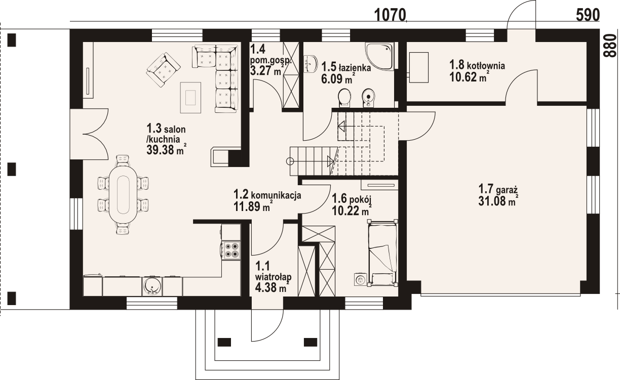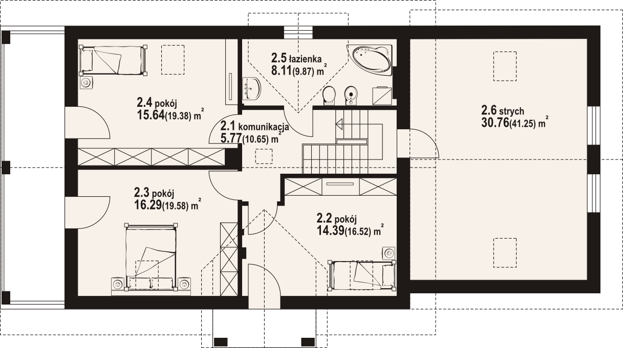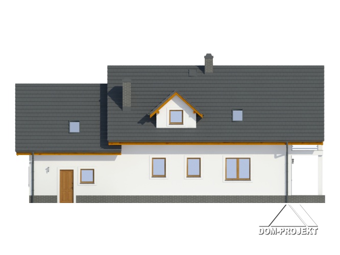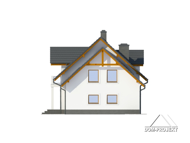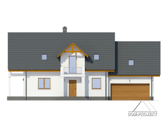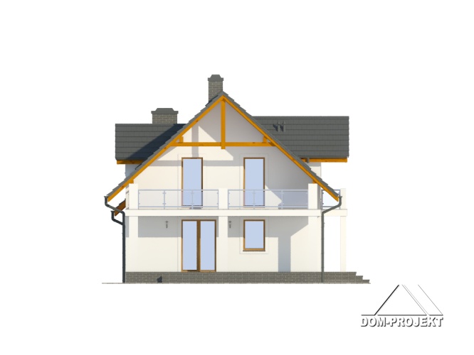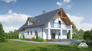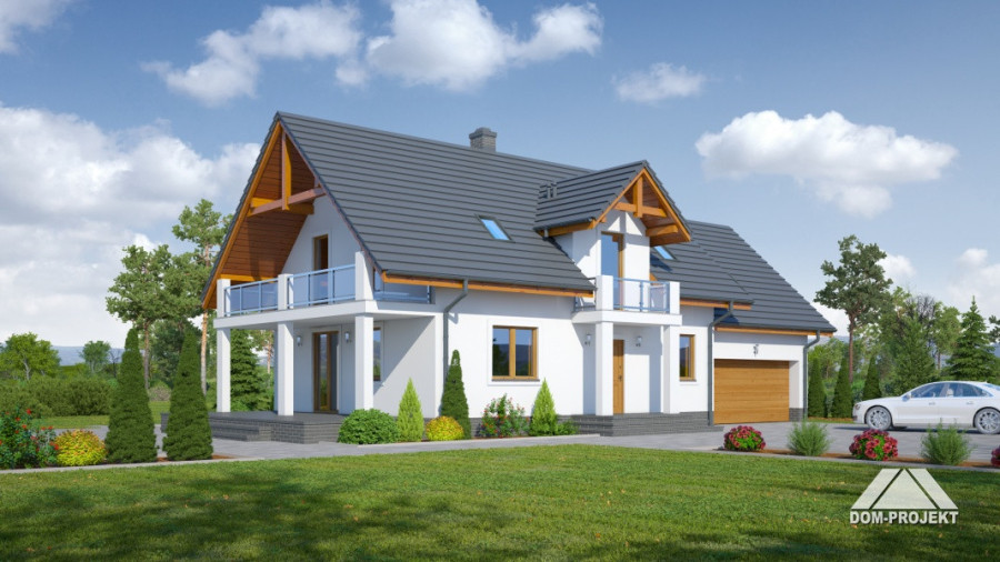 Wygodny dom dla 4-5 osobowej rodziny. Duży salon z aneksem kuchennym kominkiem i wyjściem na taras. Pokój, łazienka, pomieszczenie gospodarcze, wiatrołap, komunikacja. Garaż na dwa samochody i kotłownia. Na poddaszu trzy wygodne pokoje z balkonami, duża łazienka, komunikacja i strych. Prosta bryła budynku i dach dwuspadowy sprzyjają szybkiej oraz taniej budowie i niskim kosztom eksploatacji.