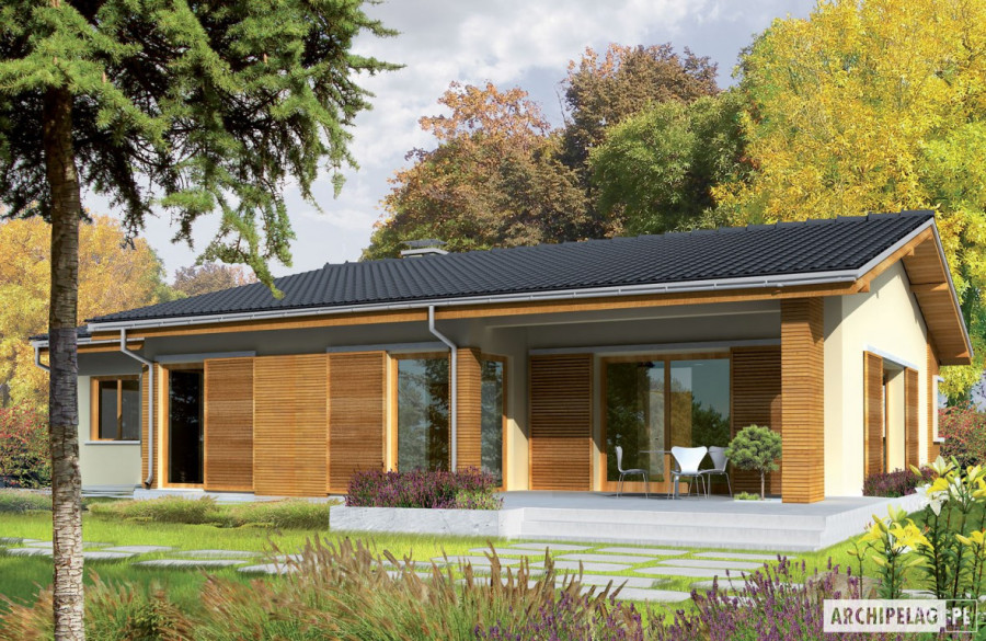 Charakterystyka: Dom parterowy, niepodpiwniczony, z garażem jednostanowiskowym Przeznaczenie: Dom dla 3-4 osobowej rodzinyTechnologia i konstrukcja: Ściany zewnętrzne: murowane, dwuwarstwowe, beton komórkowy 24 cm, ocieplenie wełna mineralna 12cm Strop: gęstożebrowy Teriva, ocieplenie wełna mineralna 25 cm Dach: konstrukcja drewniana, blachodachówka Więźba dachowa dostępna również w systemie prefabrykacji drewnianej.Rozwiązania instalacyjne:Ogrzewanie: kocioł gazowy kondensacyjny firmy Viessmann, rozprowadzenie ciepła: grzejniki firmy Purmo Wentylacja: grawitacyjna OZE: kolektory słoneczne firmy Viessmann Dodatkowo: stacja uzdatniania wody firmy ViessmannWykończenie: Elewacje: : tynk cienkowarstwowy mineralny, okładzina drewniana Stolarka: drewniana, PVC lub aluminiowa, drzwi wejściowe i brama garażowafirmy HörmannWersje - zapytaj o dostępność: - Bob - bez garażu - Bob II - bez garażu, inna aranżacja pomieszczeń, kąt dachu 20° - Bob II G1 - garaż jednostanowiskowy, inna aranżacja pomieszczeń, kąt dachu 20° - Odbicie lustrzane do każdej wersjiIstnieje techniczna możliwość: - podpiwniczenia budynku- zbliźniaczenia budynku