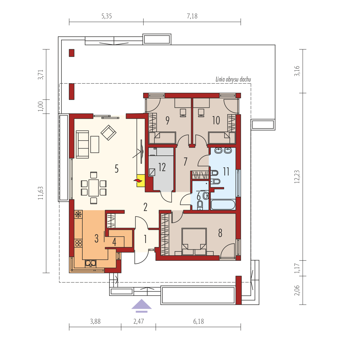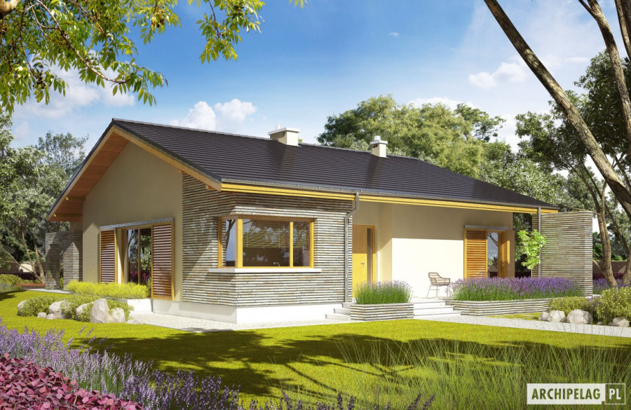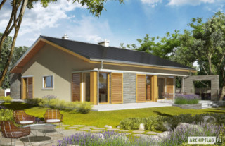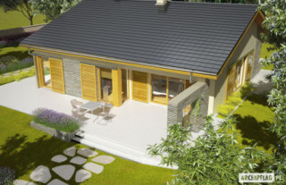Charakterystyka: Dom parterowy, niepodpiwniczony Przeznaczenie: Dom dla 3-4 osobowej rodzinyTechnologia i konstrukcja: Ściany zewnętrzne: murowane, Strop: gęstożebrowy Dach: konstrukcja drewniana, dachówka cementowaRozwiązania instalacyjne: Ogrzewanie: kocioł gazowy, rozprowadzenie ciepła: grzejniki Wentylacja: grawitacyjna Wykończenie: Elewacje: tynk mineralny i okładzina kamienna Stolarka: drewniana lub PCVWersje - zapytaj o dostępność: - Bob II G1 - garaż jednostanowiskowy - Bob - bez garażu, inna aranżacja pomieszczeń, kąt dachu 15° - Bob G1 - garaż jednostanowiskowy, inna aranżacja pomieszczeń, kąt dachu 15° - Odbicie lustrzane do każdej wersji Istnieje techniczna możliwość: - zmiany kąta nachylenia dachu do 30° - adaptacji poddasza na strych - podpiwniczenia budynku - zbliźniaczenia budynku