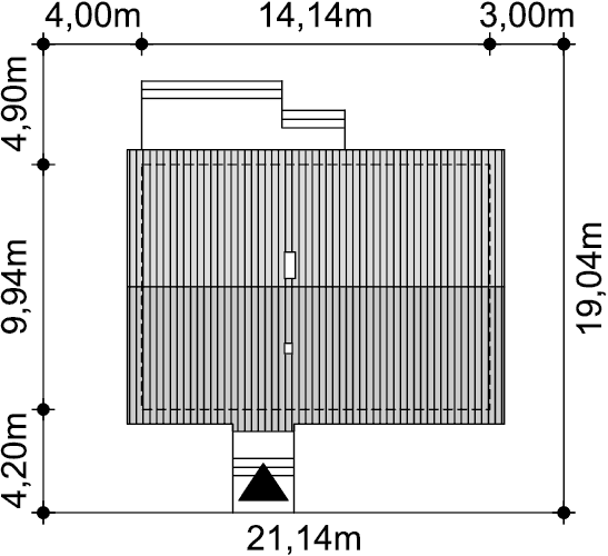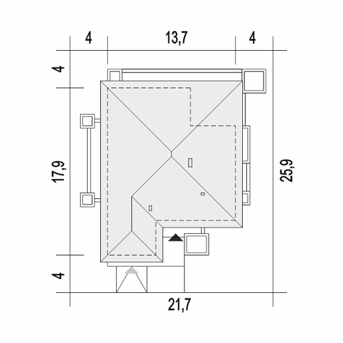 Dom parterowy. Duży salon z aneksem kuchennym, kominkiem i wyjściem na duży zadaszony taras. Trzy pokoje, łazienka, wc, spiżarka, kotłownia, wiatrołap i komunikacja. Poddasze nieużytkowe. Wejście na poddasze schodami rozkładanymi z kotłowni. Na poddaszu strych.